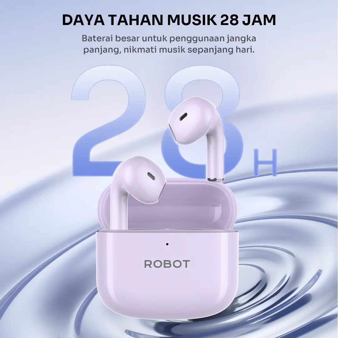 ·Daya Tahan Musik 28 Jam : Dilengkapi baterai besar untuk penggunaan jangka panjang. Memungkinkan Anda menikmati musik sepanjang hari dengan total daya tahan hingga 28 jam (dengan casing pengisi daya).