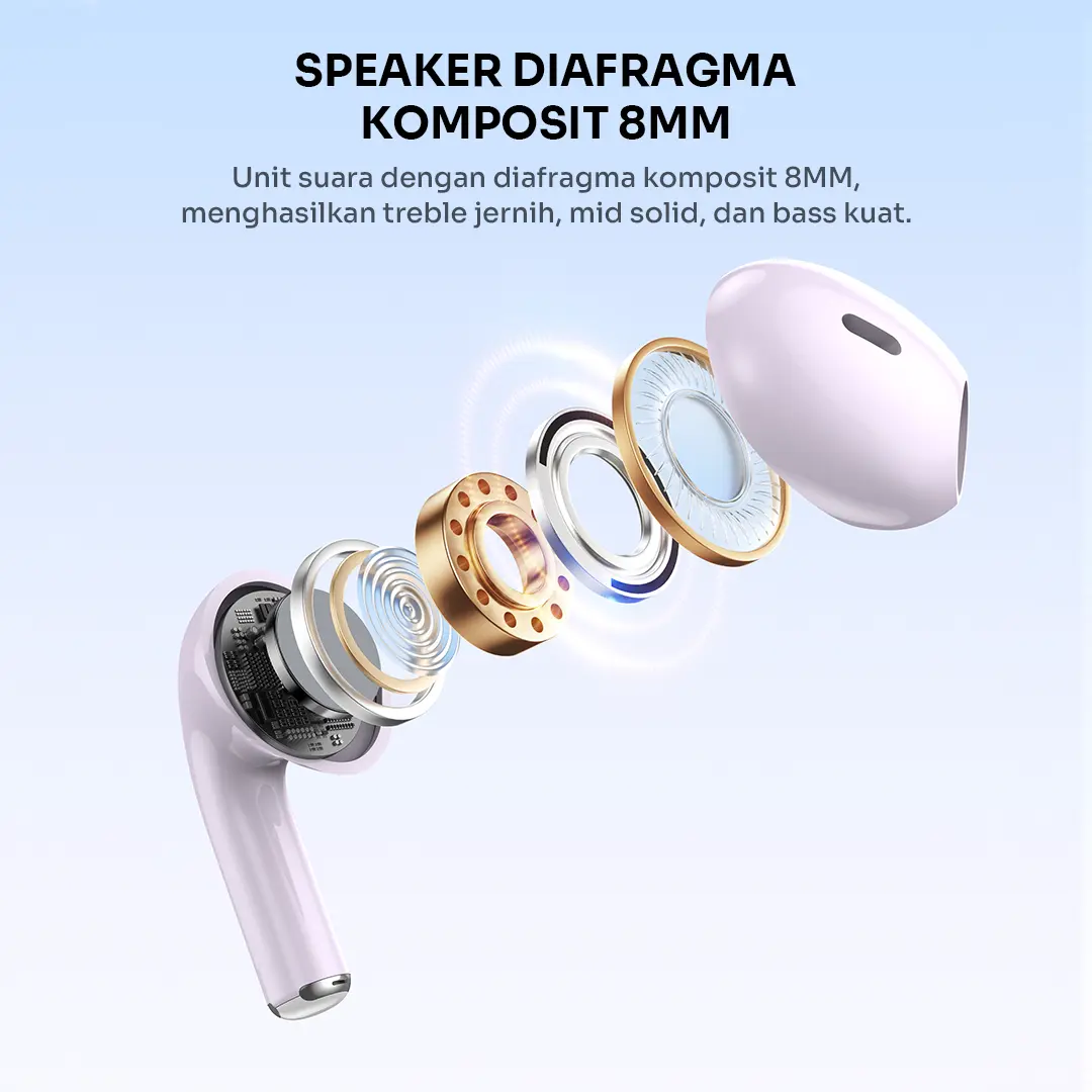 ·Speaker Diafragma Komposit 8MM : Unit suara dengan diafragma komposit 8MM.Menghasilkan treble jernih, mid solid, dan bass kuat.