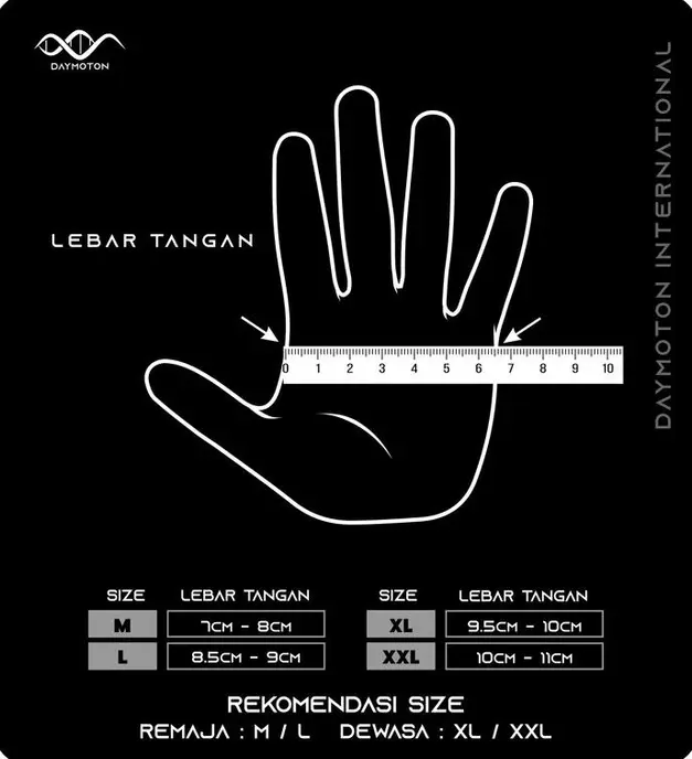 Selamat Datang Ditoko Kami.... Sering males pakai sarung tangan Motor karena designnya yang terlalu Rame? terbaru, Sarung Tangan Motor harian Series R9 dari Daymoton. dengan bahan Anti Gerah dan ada Fitur Anti Slipnya Riding harian jadi lebih Menyenangkan.3 Keunggulan Series R9:1. Bahan Anti GerahRiding di Cuaca Panas tetap asik dan gak bikin tangan jadi belang2. Fitur Anti SlipSering tangan basah dan berkeringat? dengan Sarung tangan Motor series R9, Handle Gas jadi lebih kencang3. Design SimpleCocok dipakai Harian, Style tetap KerenCara Mengukur Lebar Tangan bs cek foto :M = 7 cm - 8 cmL = 8.5 cm - 9 cmXL = 9.5 cm - 10 cmXXL = 10 cm - 11 cmREKOMENDASI SIZERemaja : M / LDewasa : XL / XXL Happy Shopping