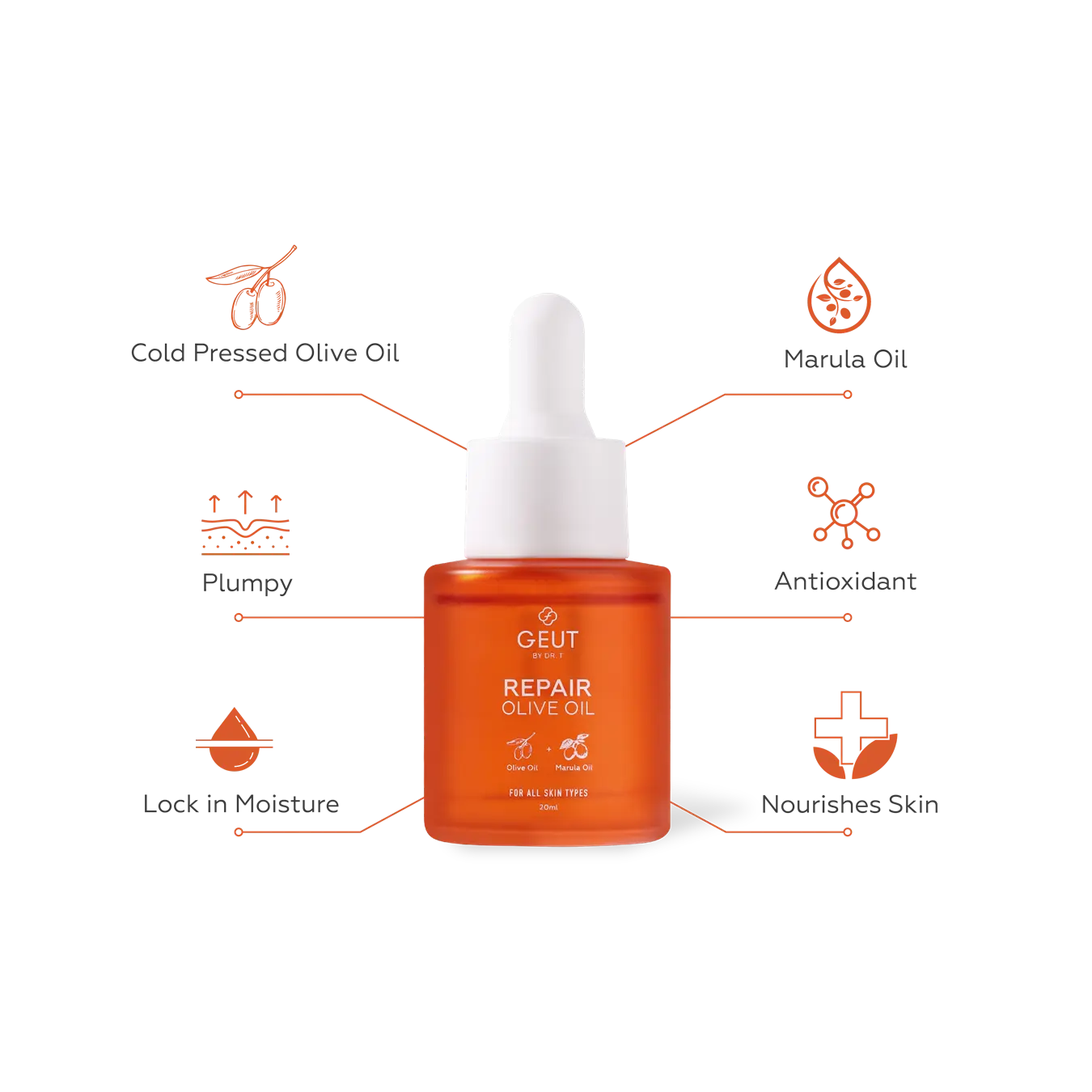 GEUT Repair Olive Oil dapat membantu mengunci hidrasi kulit, dengan mengurangi penguapan air dari dalam kulit dan masuknya polusi. Marula Oil yang mengandung asam lemak alami, juga berfungsi sebagai penambal kerusakan di skin barrier agar struktur lemak alami kulit kembali seimbang.