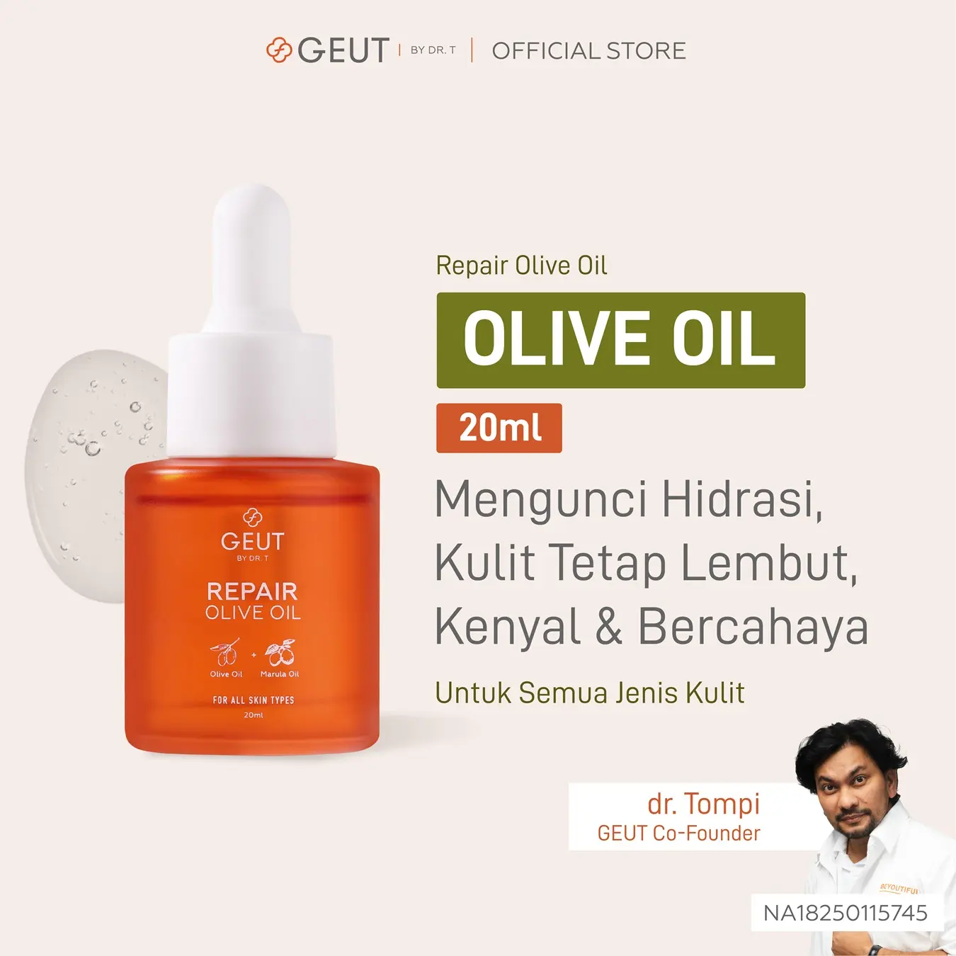 Aplikasikan GEUT REPAIR Olive Oil secara rutin 1-2 tetes secara merata di wajah, pada tahap akhir skincare di malam hari. Dapat digunakan juga untuk kondisi kulit yang kering, kasar atau iritasi.