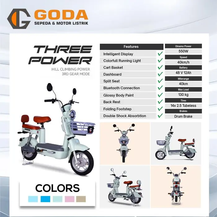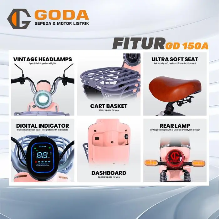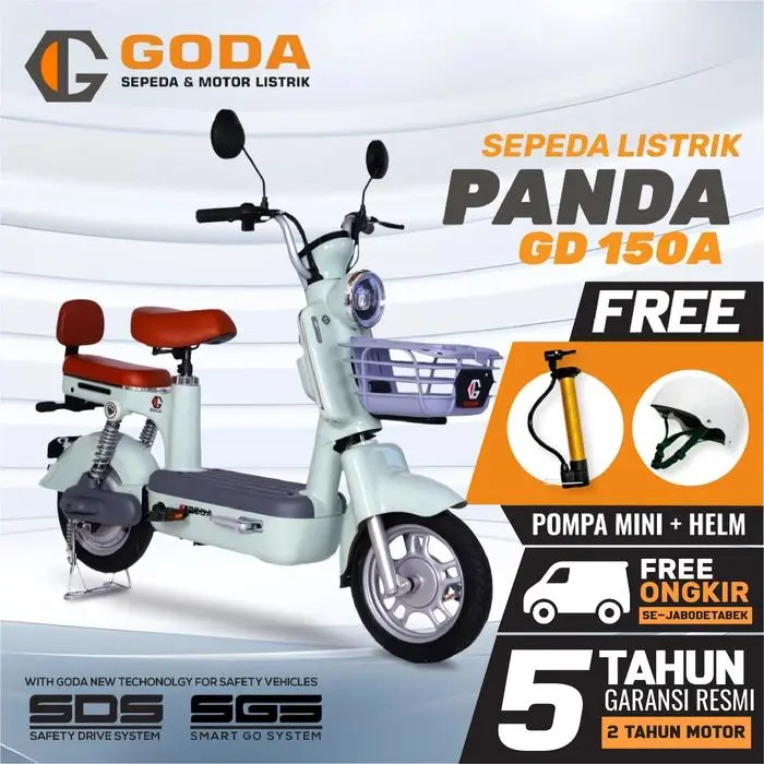 Panda GD150A - 48V 12Ah 550W Desain fantastis yang membuat Anda berbeda! Sebagai produk paling populer didunia maya. Vintage Headlamps Cart Basket Digital Indicator Dashbord Ultra Soft Seat Rear Lamp Intelligent Display LED Daytime Running Light LED Headlamps Double Swing Footstep Split Seat Backrests Double Shock Absorption Glossy Body Paint Spesifikasi GODA Panda GD150A : Dinamo 550W | 48V 12Ah Max Kecepatan 40 km/j Max Jarak Tempuh 45 km Max Beban 130 kg Ban Tubless Drum Brakes Setiap pembelian unit sudah include : 1 Charger 48 V, 12 Ah 2 pcs Spion (Kanan & Kiri) 2 pcs Pedal Kebijakan Garansi: - Motor power assy (dinamo) 2 tahun - Baterai 6 bulan - Controller & charger 3 bulan - Front fork & shock absorber 6 bulan - Roda depan, belakang & velg 1 tahun - Rangka 5 tahun