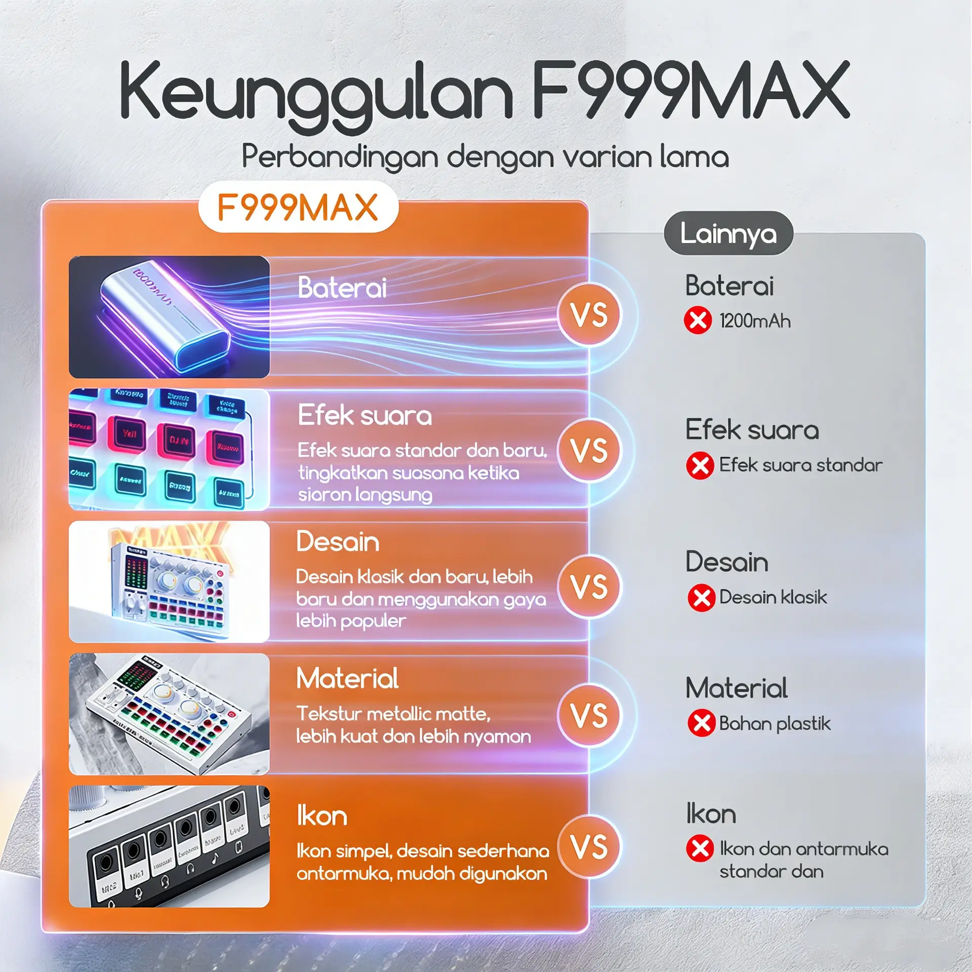 F999MAX dirancang untuk siaran langsung. Nikmati nada dering pintar/perubahan suara ajaib. Dengan berbagai mode siaran langsung, penyesuaian tinggi/bass independen memberikan suara treble manis dan bass dalam. Anda dapat menyesuaikan suara secara detail untuk hasil optimal.