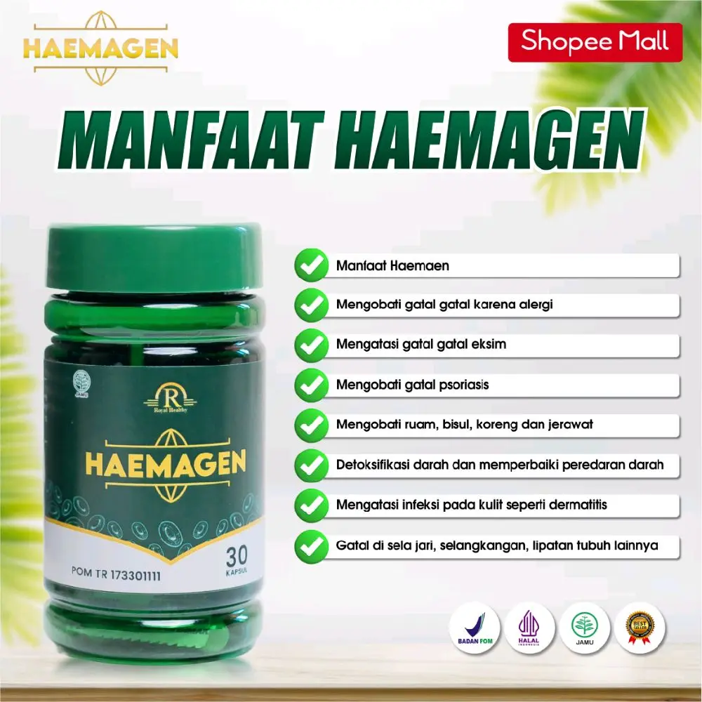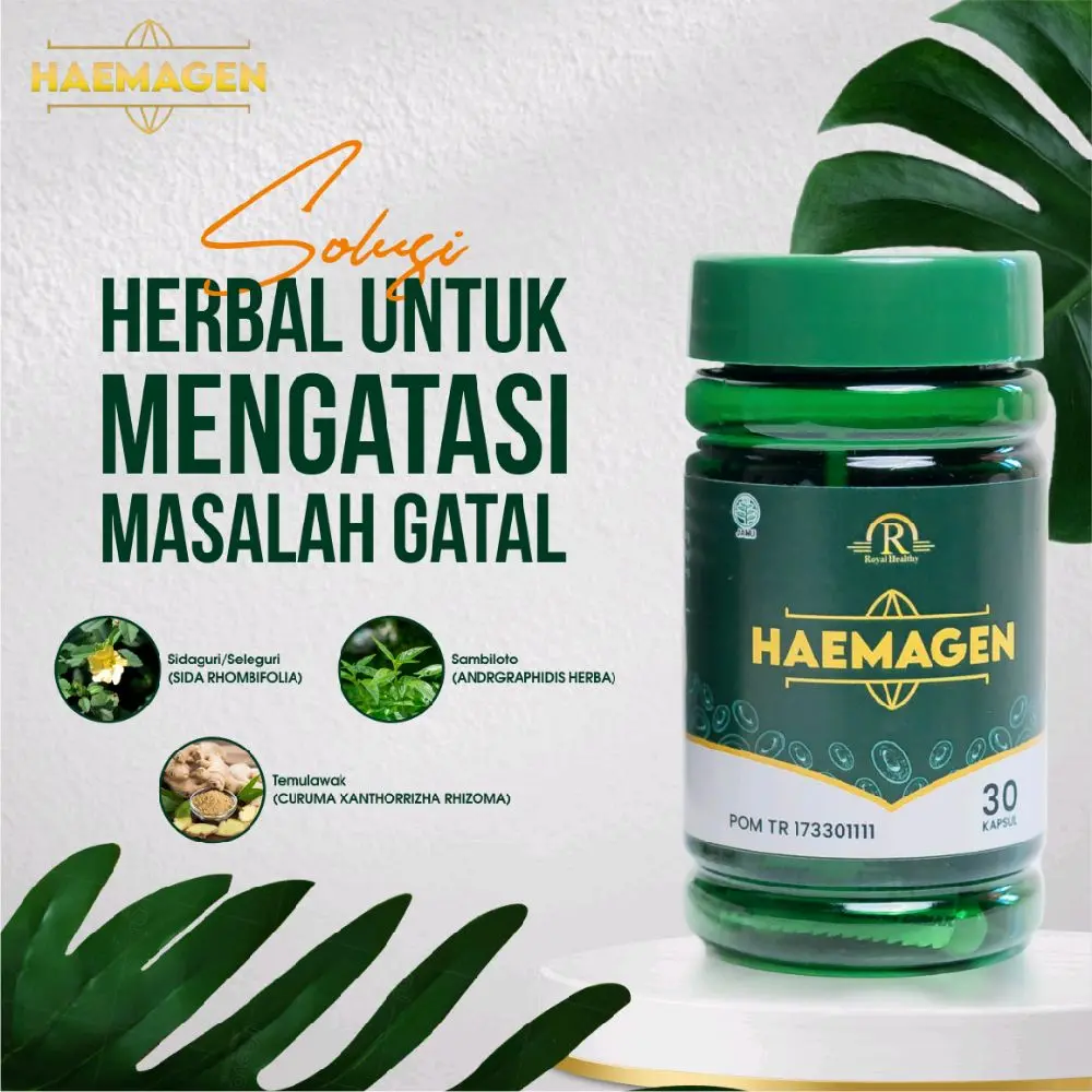 HAEMAGEN adalah produk herbal alami yang dapat membantu mengatasi masalah kulit seperti gatal-gatal, eksim, alergi, ruam, jerawat, dan panu.