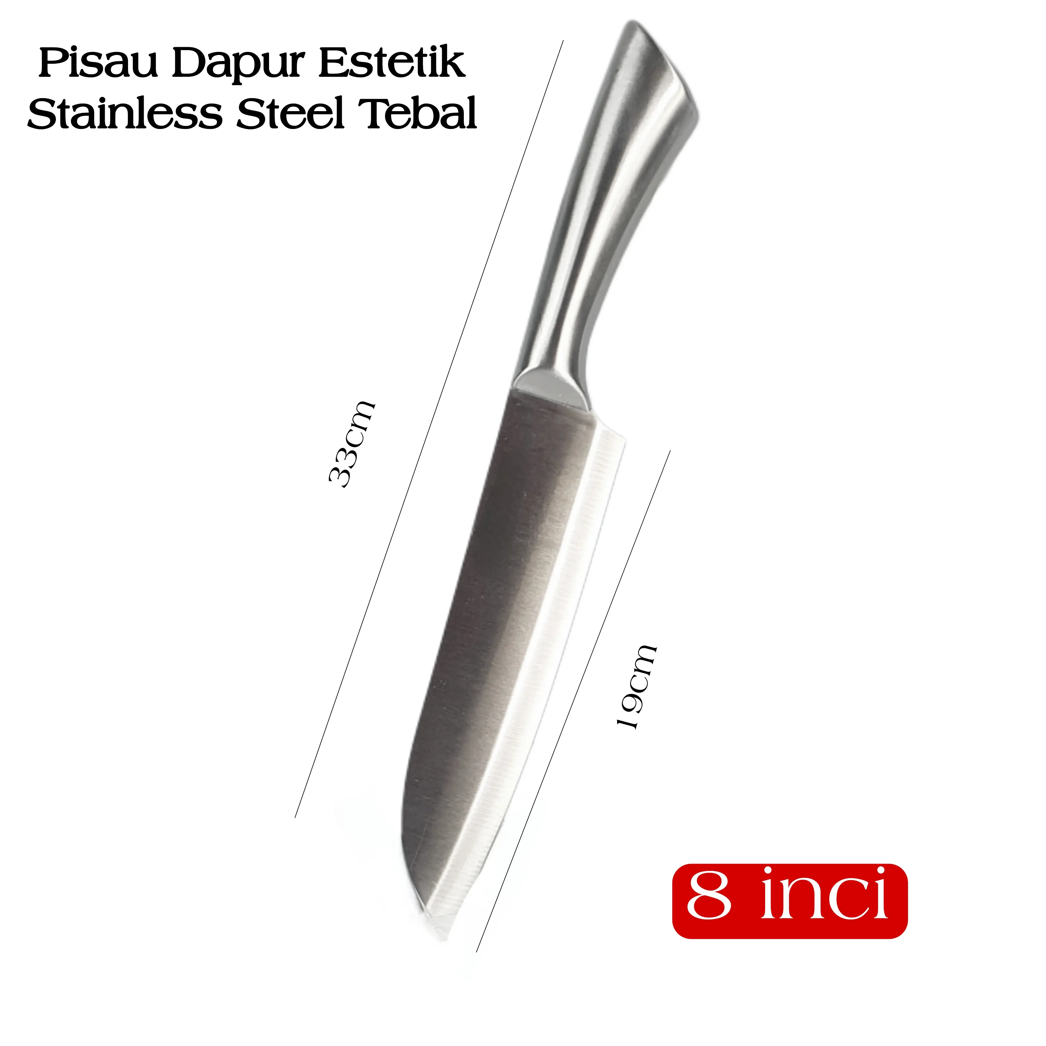 Pisau Dapur yang Tahan Karat Pisau Koki Chef Stainless Steel ini memiliki ukuran 8 inci. Ia dirancang untuk memotong daging, memotong, maupun mencincang. Pisau ini tahan karat, menjadikannya pilihan yang tepat untuk dapur Anda.