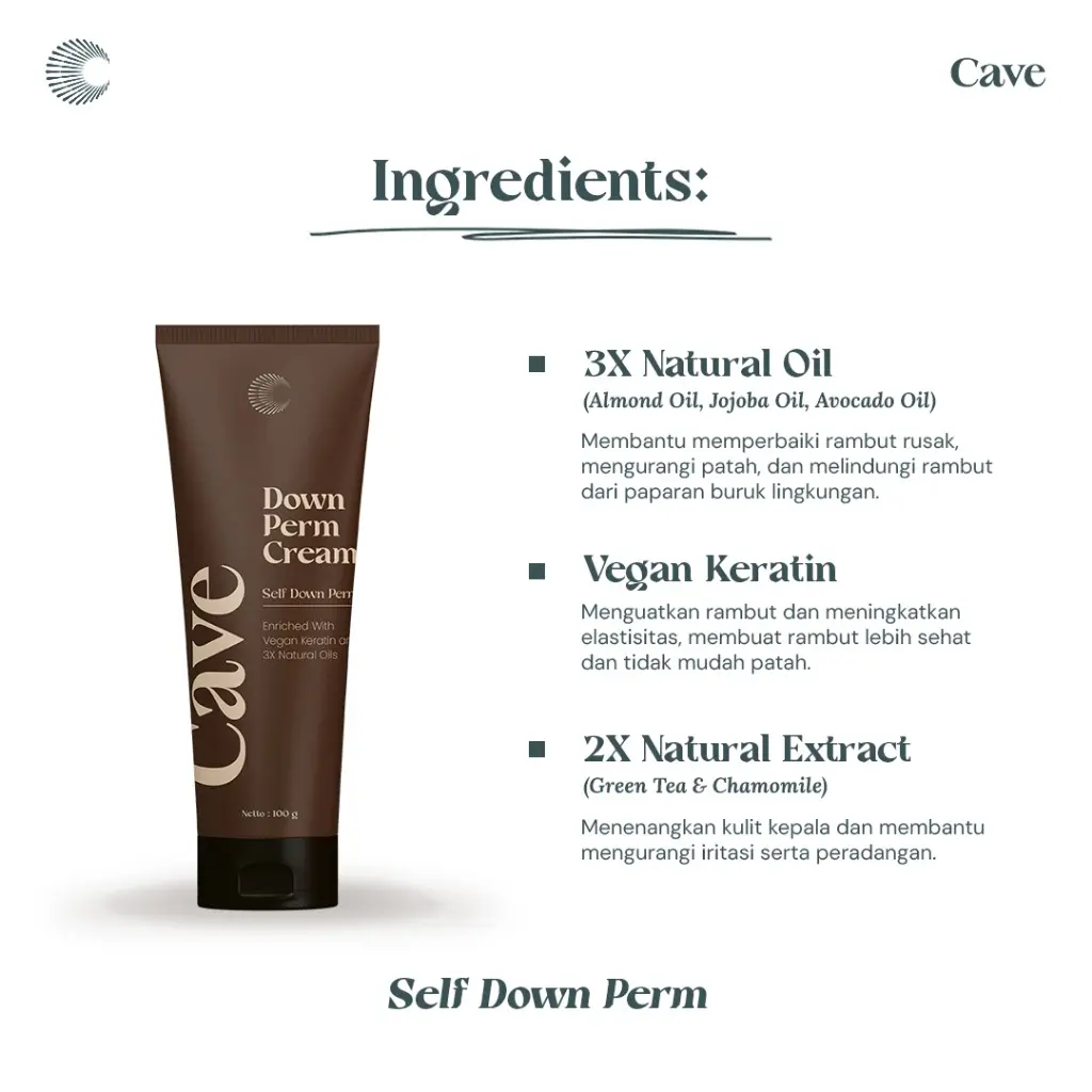 Cave Down Perm Cream merupakan produk chemical treatment yang dapat mengempiskan rambut yang mengembang dan meluruskan rambut keriting dalam waktu 15 menit. Cave Down Perm Cream diformulasikan dengan tambahan 3X Natural Oils yang baik untuk melindungi rambut dan kulit kepala serta memberi nutrisi pada rambut. CAVE Down Perm Cream juga diperkaya dengan Vegan Keratin yang akan menjaga kesehatan rambut dan melembutkan rambut sehingga rambut tetap sehat dan mudah diatur setelah ditreatment.