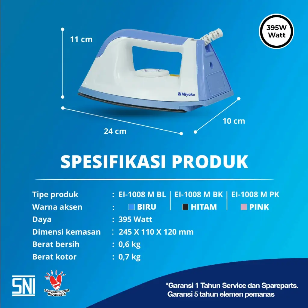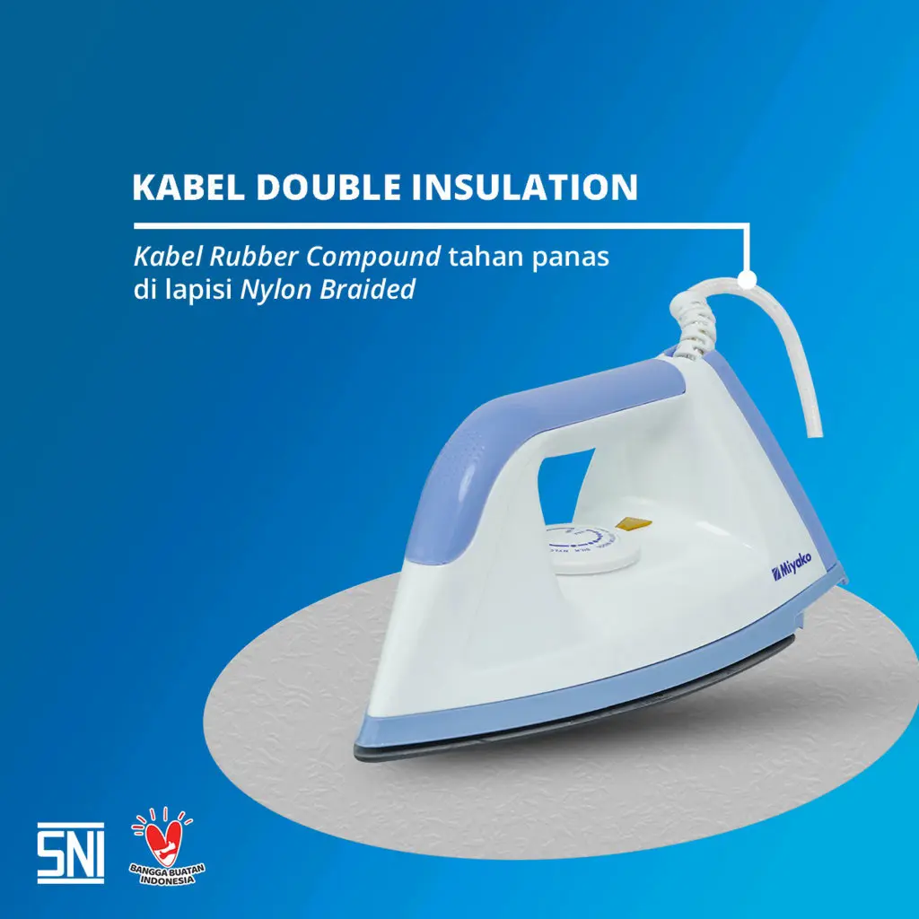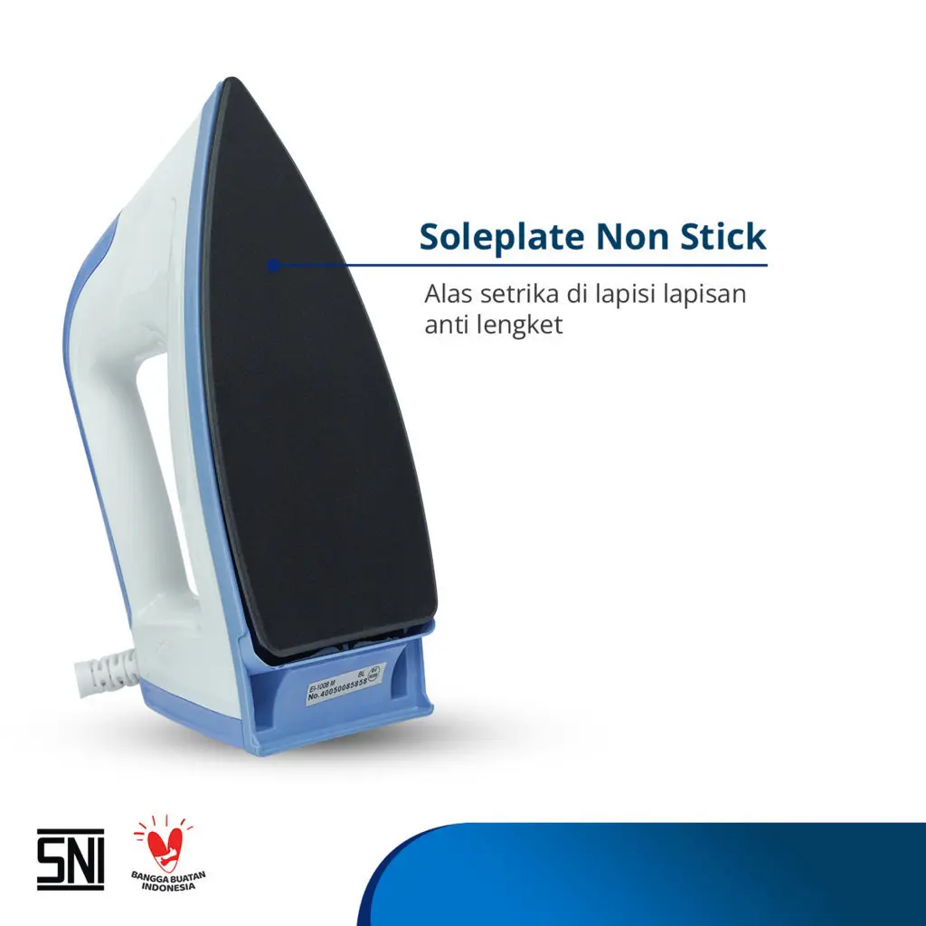 Merupakan setrika listrik fungsional dengan harga yang ekonomis. Setrika ini memiliki alas setrika (sole plate) dengan bahan berkualitas sehingga alas anti lengket dan lebih licin, jadi kegiatan menyetrika lebih mudah dan nyaman. Pelindung kabel listrik dengan double insulation (nylon braided dan rubber compound) yang melindungi kabel setrika agar lebih tahan lama dan aman.