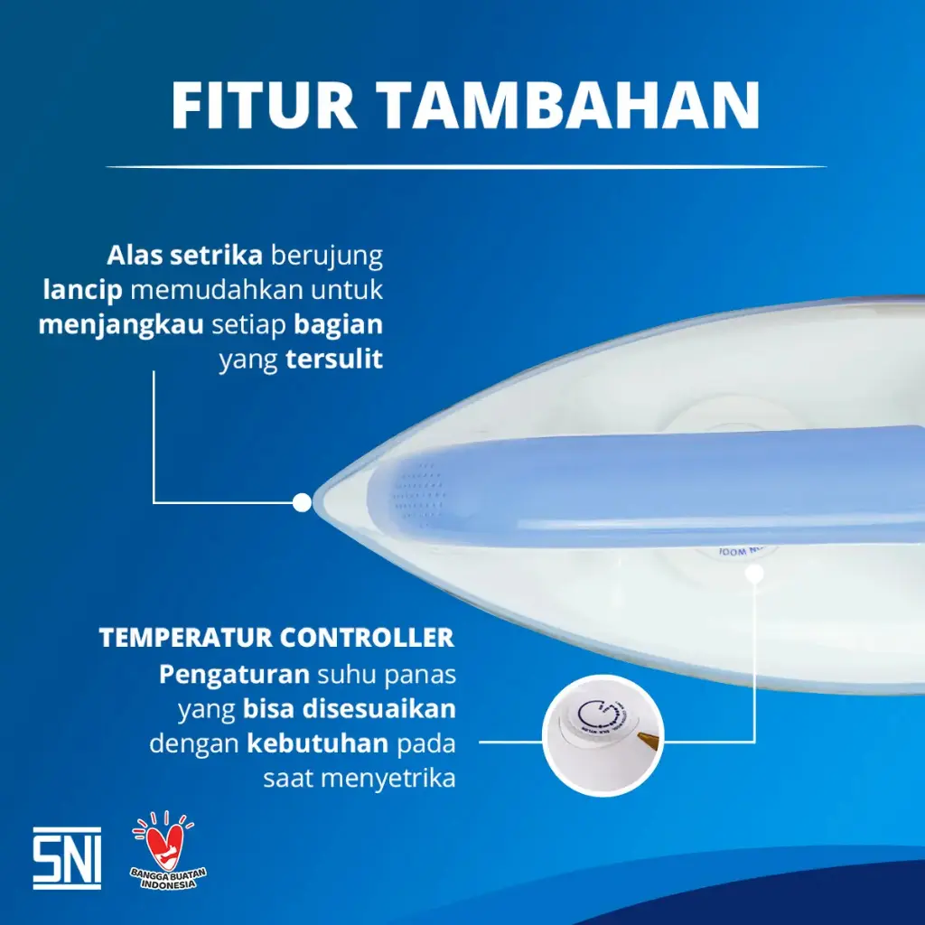 Setrika yang dilengkapi dengan temperature controller untuk mengatur suhu sesuai dengan kebutuhan dan indicator lamp yang menandakan setrika sudah siap untuk digunakan. Bentuk alas setrika yang lancip menjadikan kegiatan menyetrika lebih mudah apalagi untuk bagian – bagian yang sulit seperti kerah, kancing dan lipatan baju. Handle yang ergonomis menjadikan kegiatan menyetrika lebih nyaman dan standar SNI yang menjaga keaman produk.