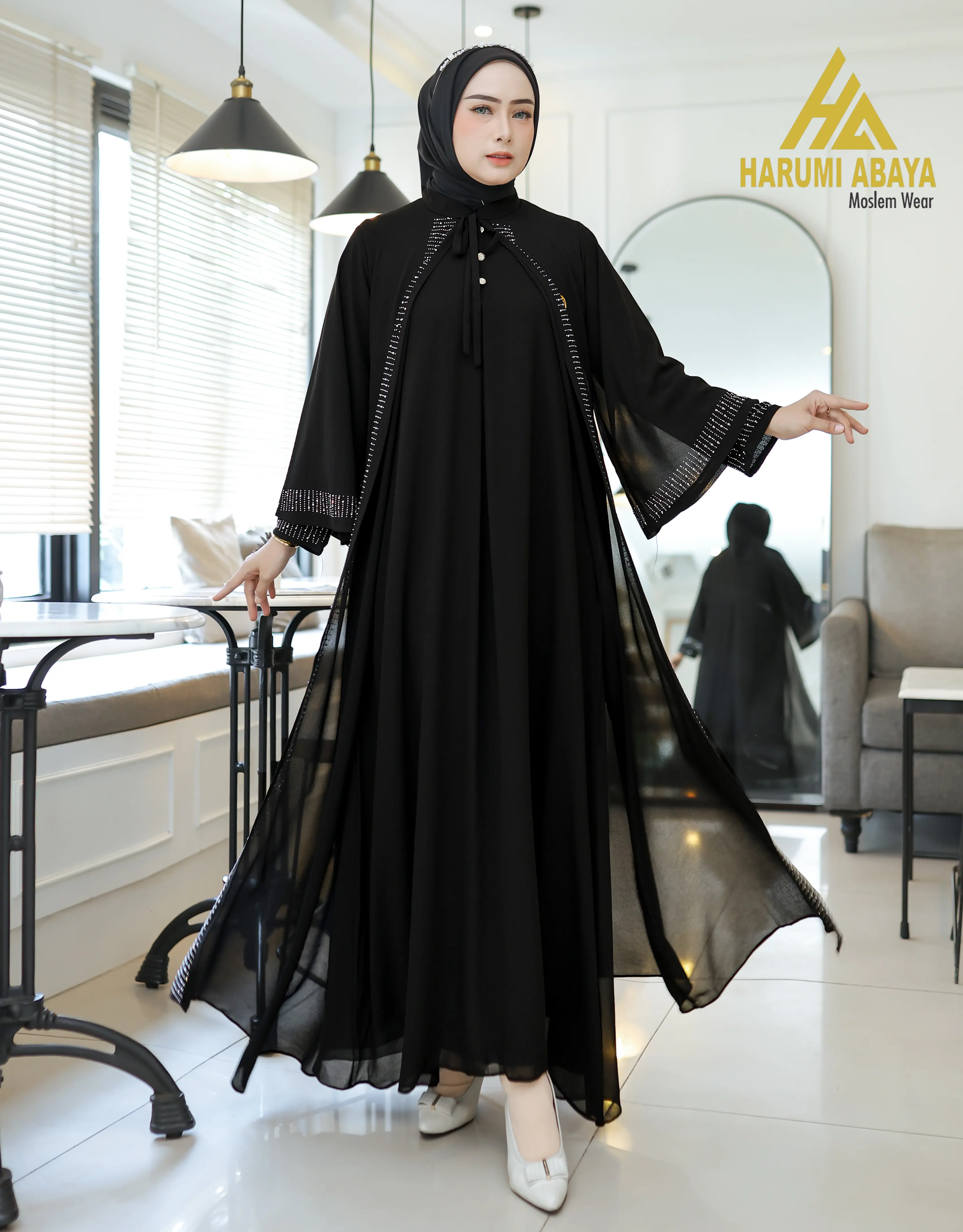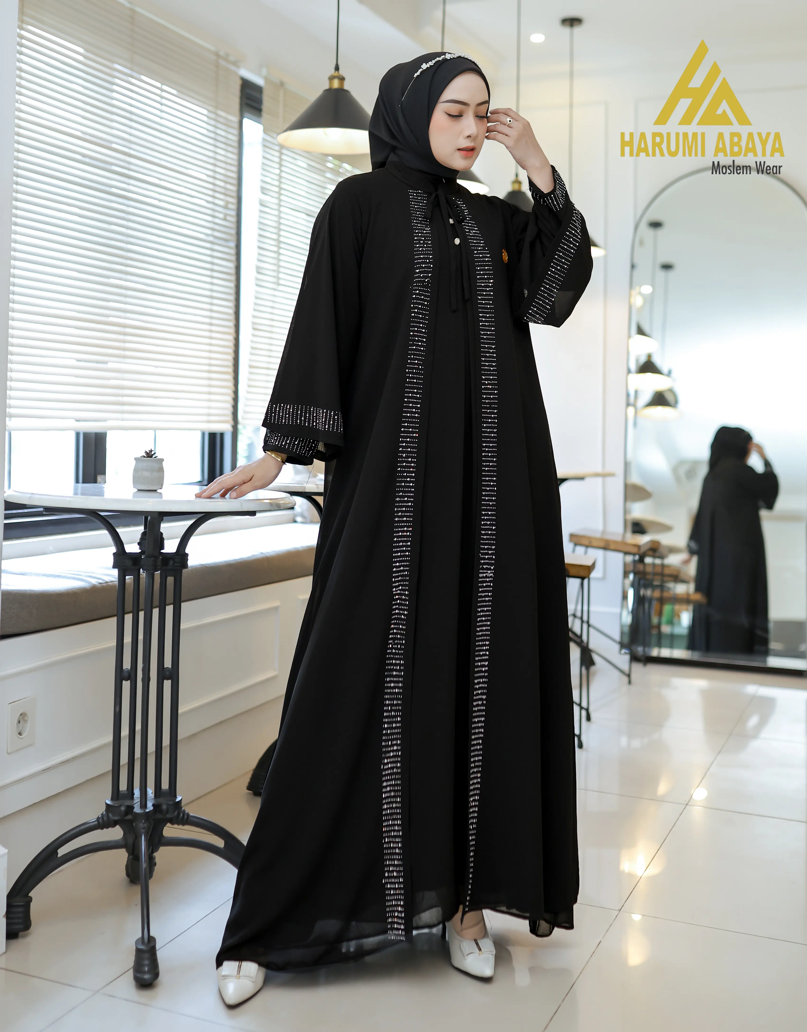 Abaya Gamis Harumi ini adalah pilihan yang tepat untuk Anda yang mencari abaya elegan dengan hiasan Swarosky. Dengan desain yang elegan dan bahan ceruty, abaya ini akan membuat Anda tampil anggun.