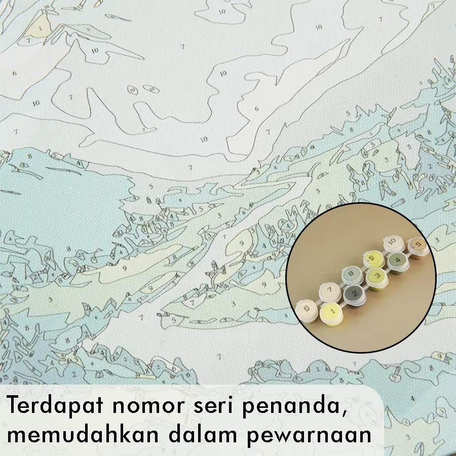 ·Kanvas telah dicetak dengan pola bergambar dan setiap area memiliki nomor yang sesuai dengan wadah cat, membuat proses melukis menjadi sangat mudah diikuti.