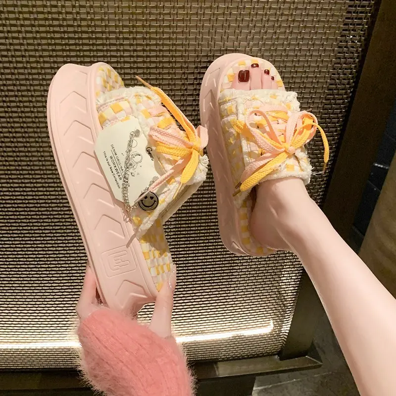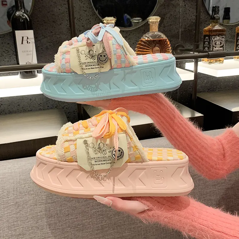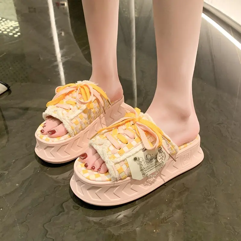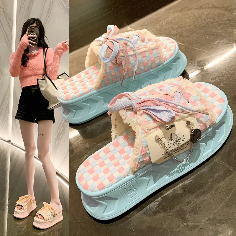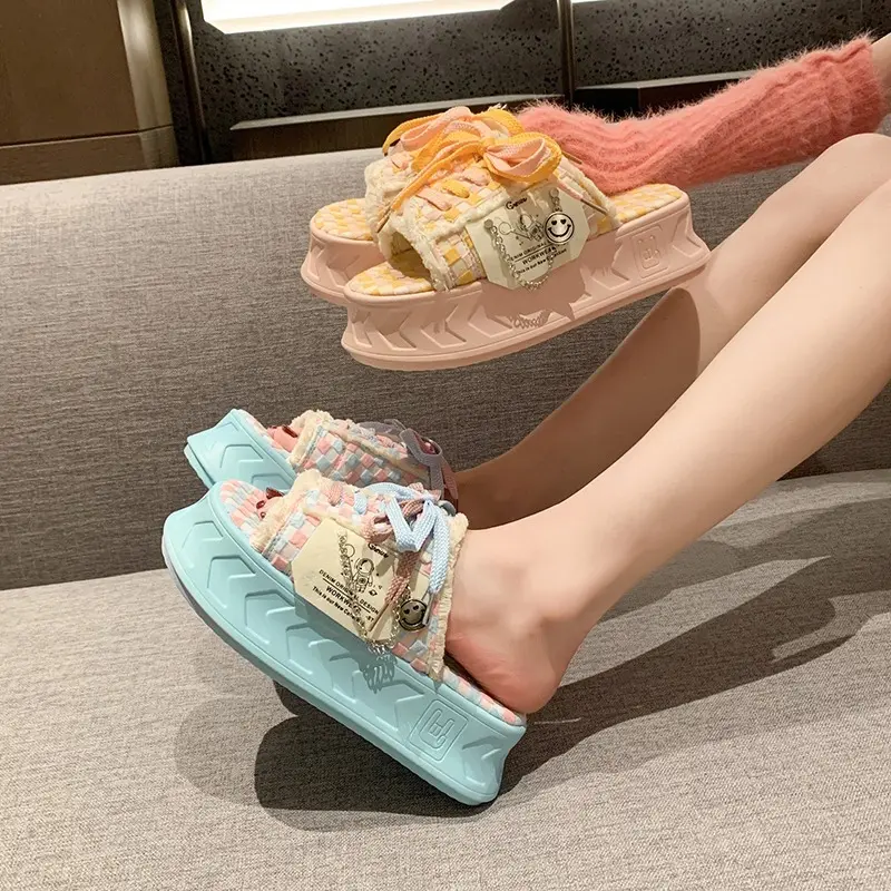 6CM Kawaii Summer Women Weave Slippers Platform Shoes Fashion Mules Flip Flops Candy Color Sandals Flat Casual Shoe For Female