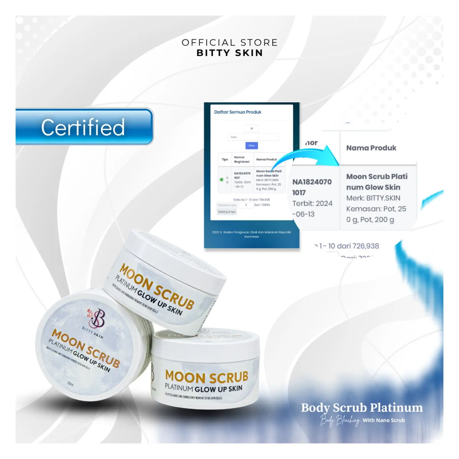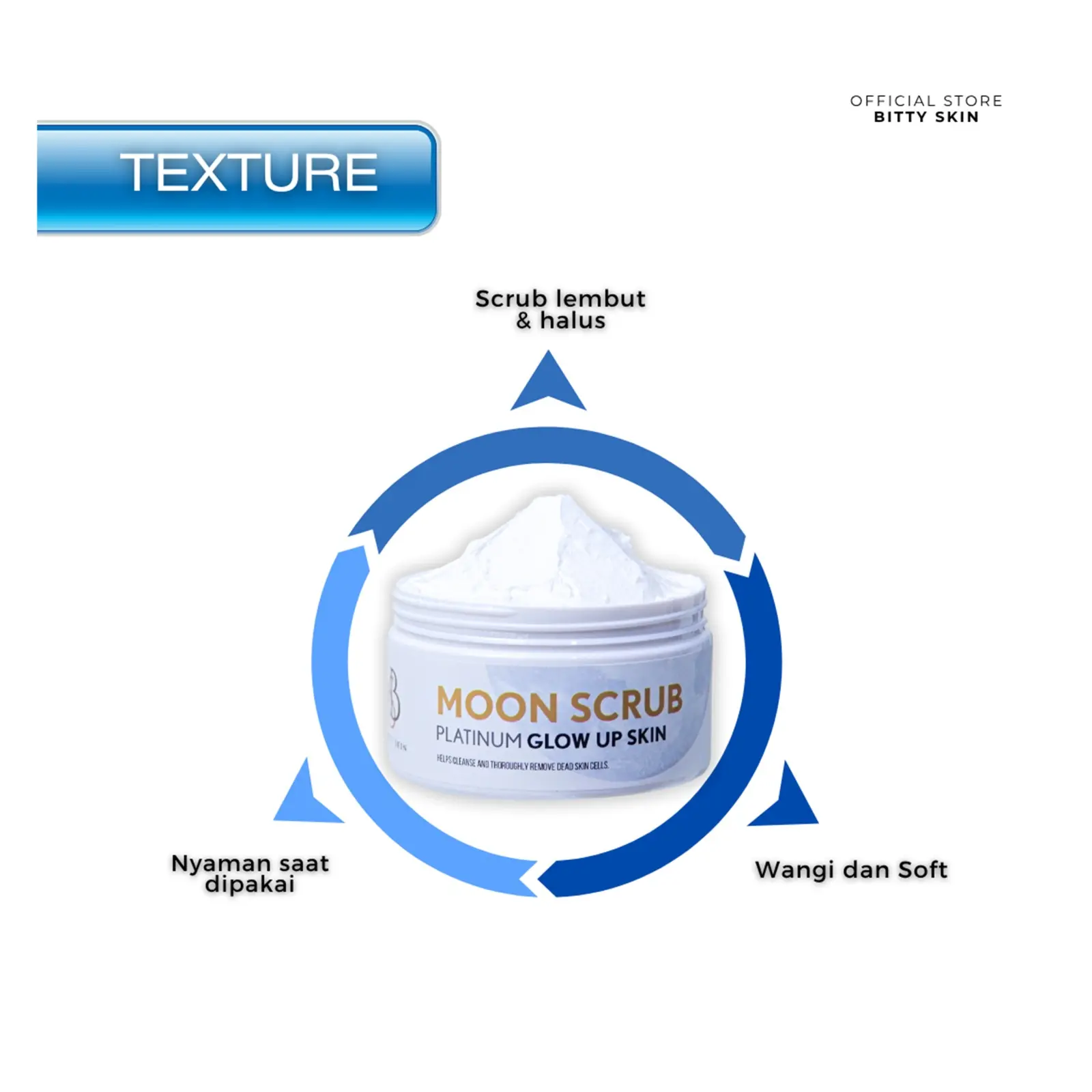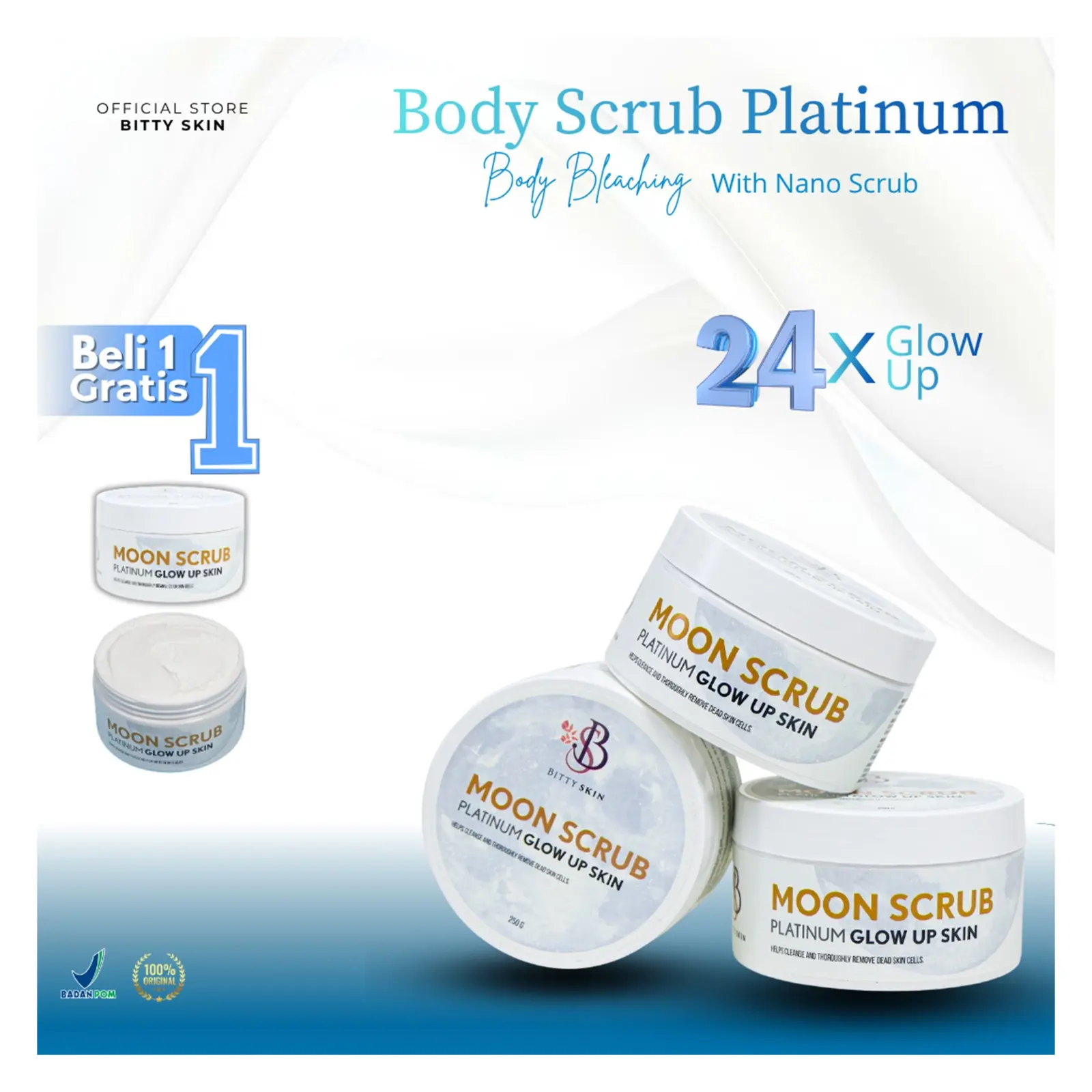 MOON SCRUB PLATINUM adalah Body Scrub + bleaching yang diformulasikan dengan tekstur krim lembut dan tidak akan membuat kulit kering serta iritasi. Diperkaya dengan Triple Brightening Active membantu mencerahkan, mengurangi noda hitam dan meratakan warna kulit. Membantu menjaga kulit dari radikal bebas, meluruhkan sel-sel kulit mati serta membuat kulit terasa cerah, lembut dan halus.