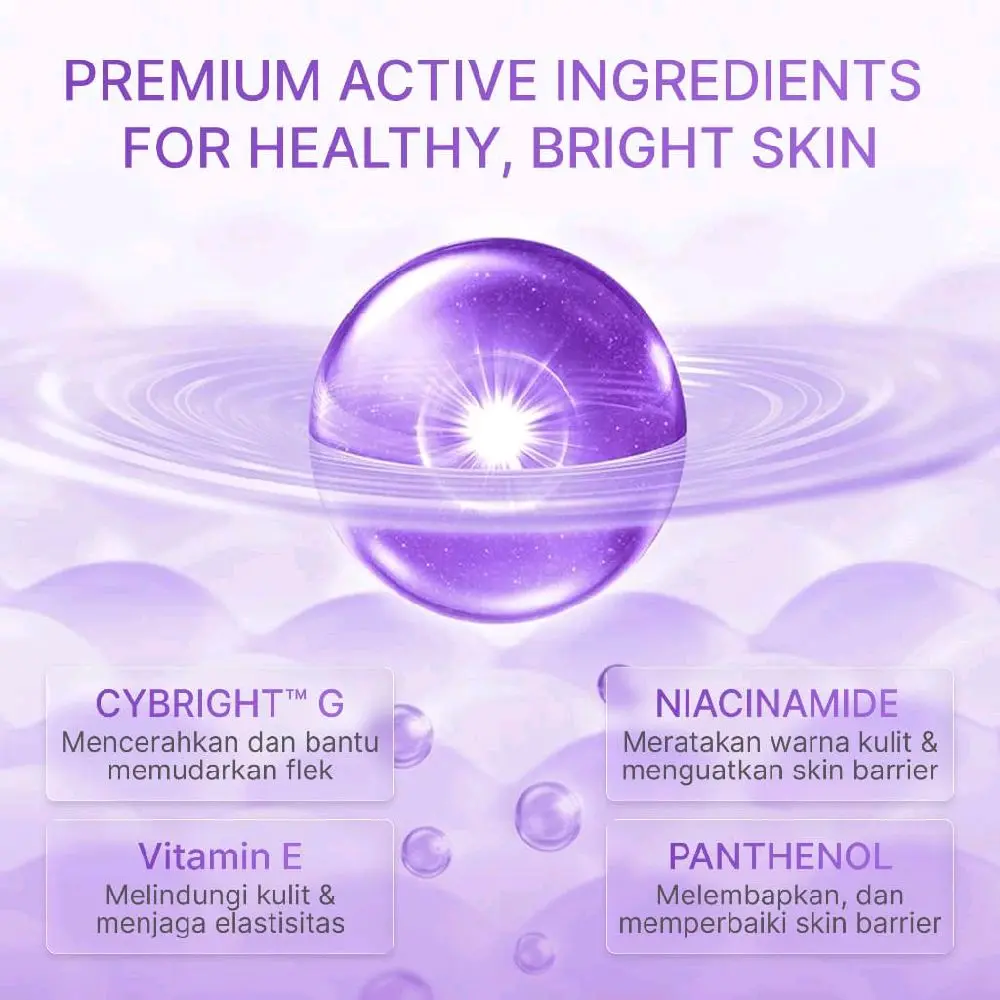 CYBRIGHT G dan Niacinamide membantu memudarkan noda gelap, mencerahkan wajah, dan meratakan skin tone.