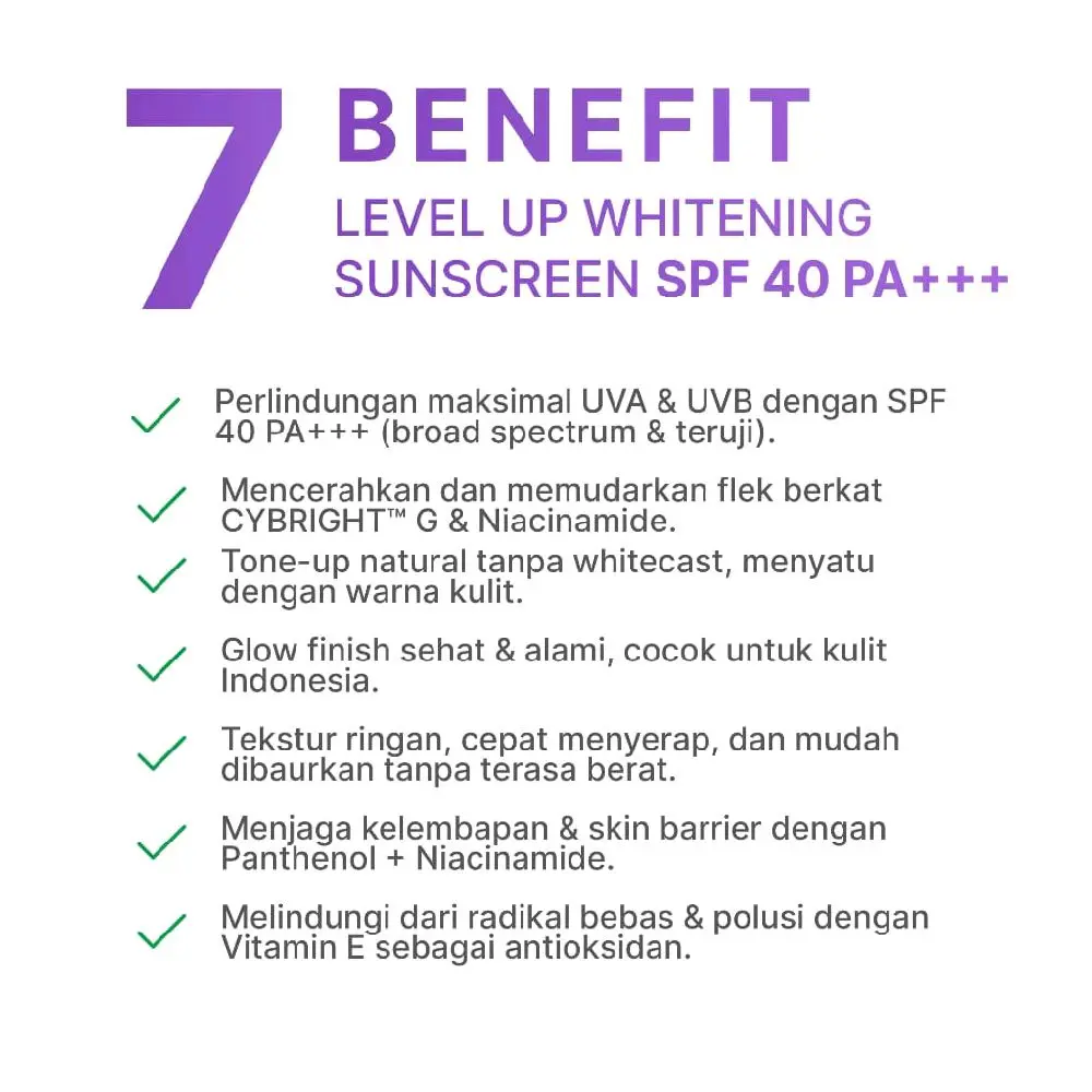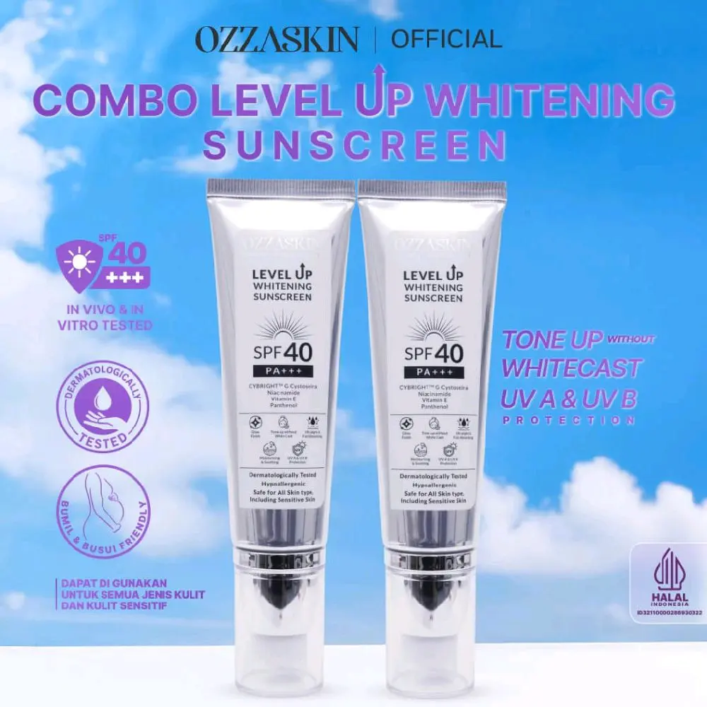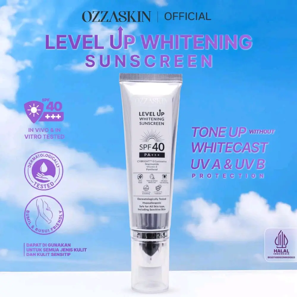 Ozzaskin Level Up Whitening Sunscreen SPF 40 PA+++, sunscreen multifungsi dengan perlindungan UVA & UVB, efek tone-up natural, serta tekstur ringan yang mudah dibaurkan. Diformulasikan dengan CYBRIGHT G, Niacinamide, Vitamin E, dan Panthenol untuk mencerahkan, menjaga skin barrier, dan memberikan hasil glow finish alami tanpa white cast.