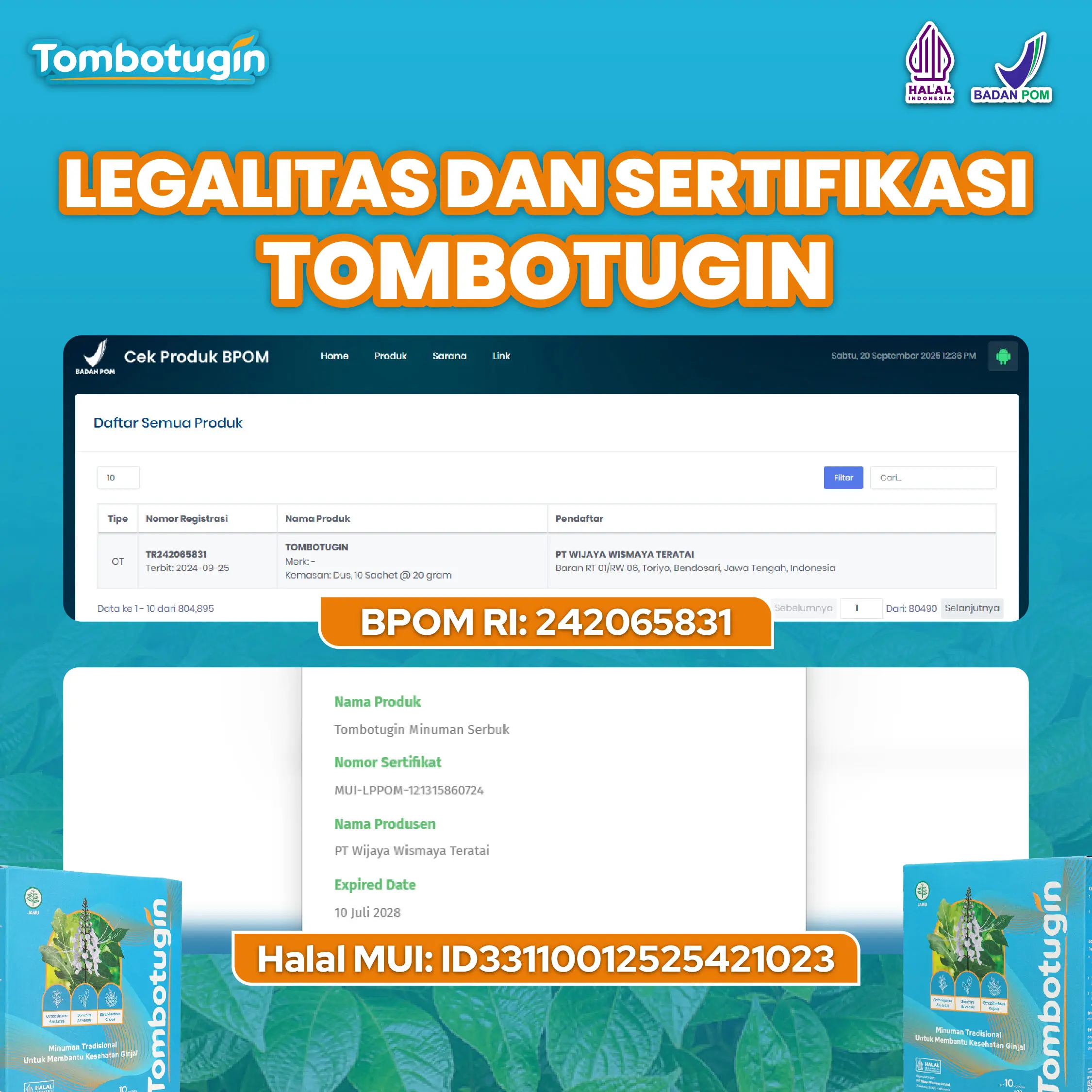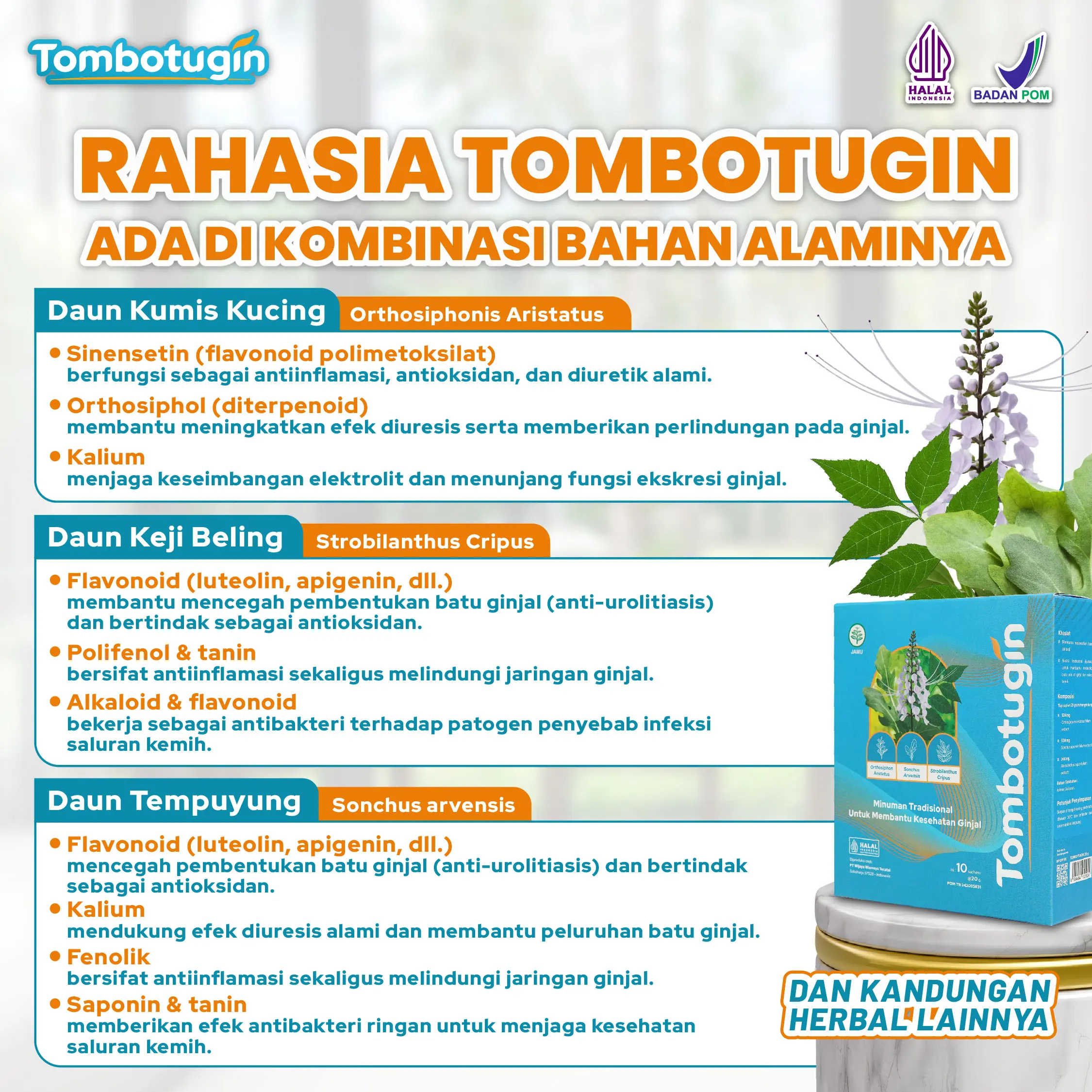 Tombotugin adalah minuman herbal serbuk instan dengan rasa segar dan ringan, diformulasikan dari bahan-bahan herbal pilihan yang dikenal sejak lama sebagai sahabat ginjal. Perpaduan ekstrak daun kumis kucing, tempuyung, keji beling, seledri, rosella, temulawak, hingga blackcurrant membuatnya kaya manfaat untuk mendukung fungsi ginjal tetap optimal. Dibuat dengan teknologi modern, Tombotugin hadir dalam bentuk serbuk instan yang praktis, enak, dan aman diminum setiap hari.