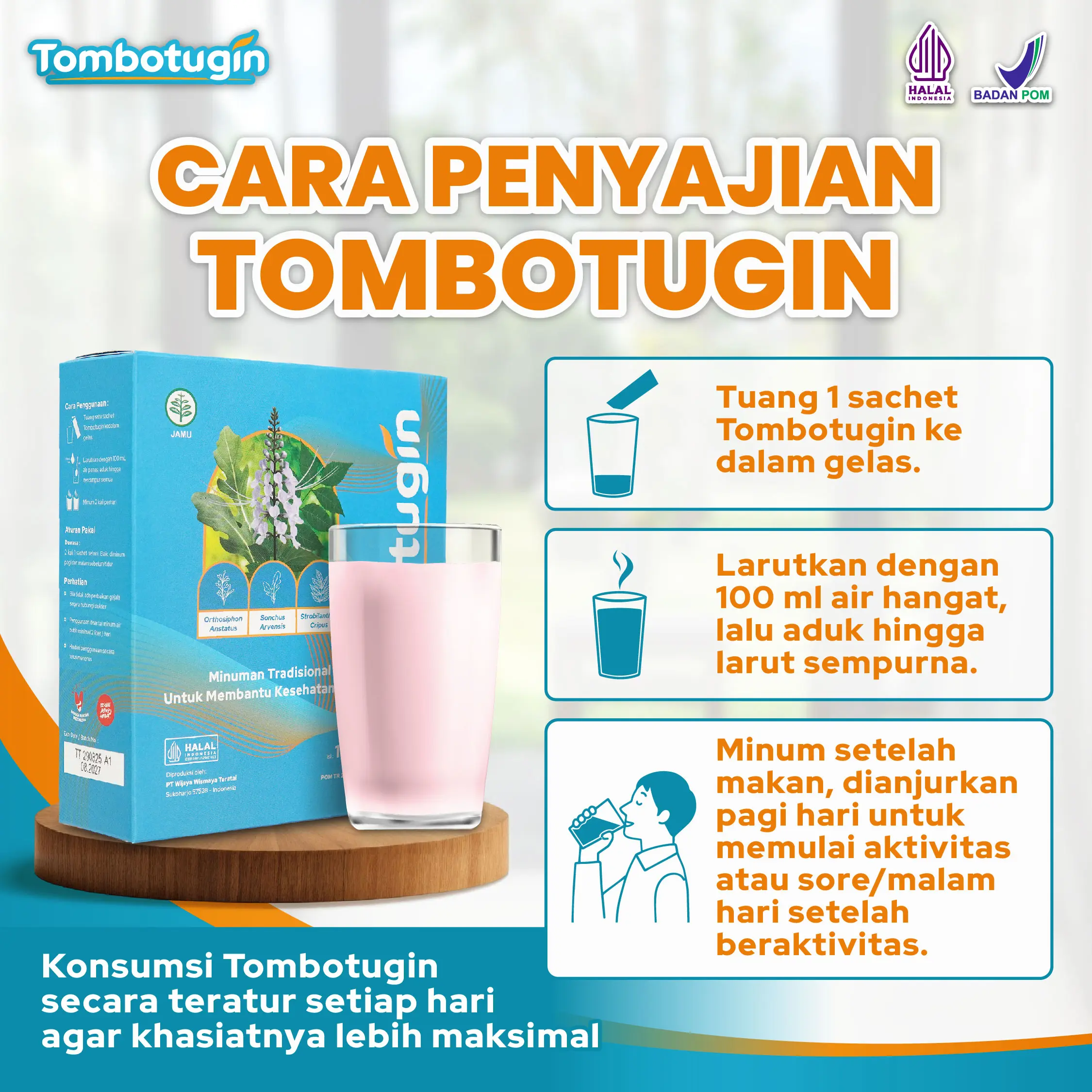 Tuang 1 sachet Tombotugin (10gr) ke dalam gelas. Larutkan dengan 100ml air hangat, aduk rata, lalu minum. Konsumsi 2 kali sehari, pagi dan sore untuk hasil optimal. Rutin minum Tombotugin membantu ginjal lebih terjaga, buang air lebih lancar, dan badan terasa lebih ringan.