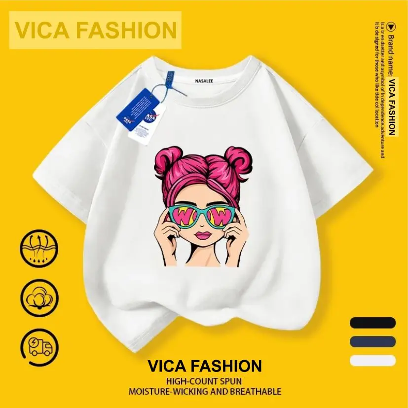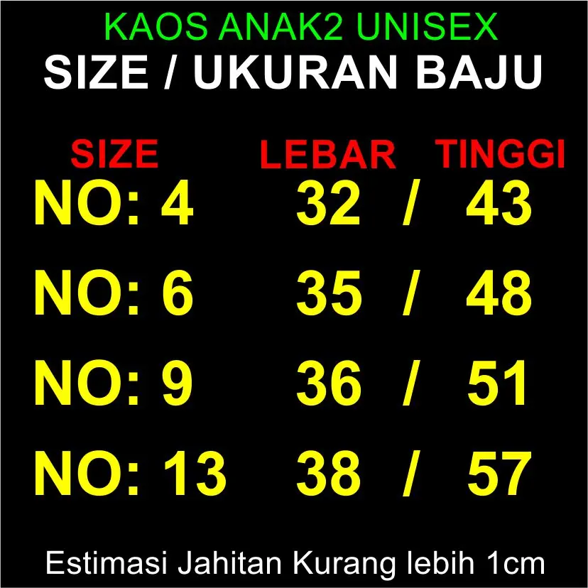 Kaos anak ini terbuat dari 100% cotton combed. Sablon digital transfer film (DTF) berkualitas tinggi, kuat, tidak runtuh, dan mengkilap. Perkiraan ukuran: No 4 (2-4 tahun), No 6 (5-7 tahun), No 9 (7-10 tahun), No 13 (10-12 tahun). Pastikan ukur lebar dan tinggi anak sebelum order.