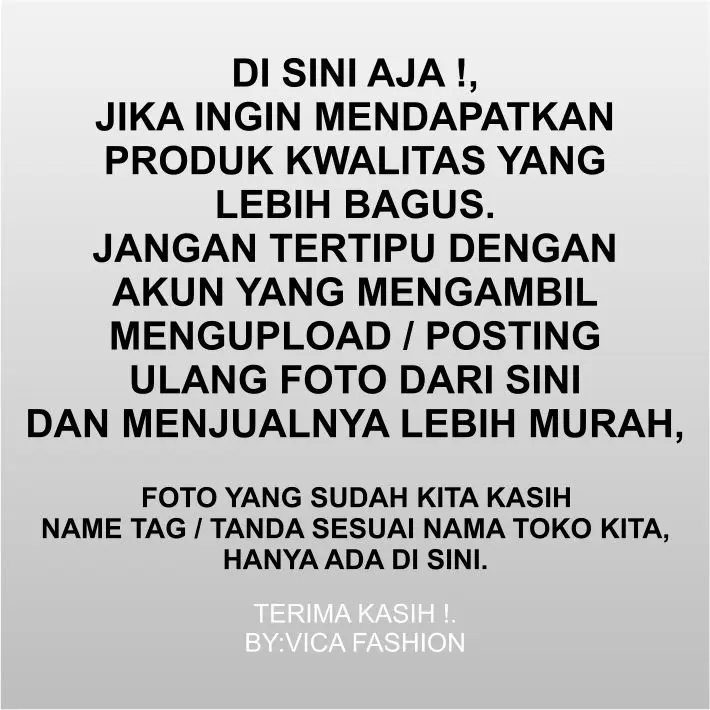 Selamat datang di VICA FASHION! Sebelum memesan, harap baca deskripsi atau chat admin untuk informasi lebih lanjut. Pilih varian warna dan ukuran sesuai kebutuhan. Kami menjamin kualitas produk, dan toko VICA FASHION adalah satu-satunya. Jika menggunakan gambar cantik, kualitas produk akan lebih baik. Terima kasih!