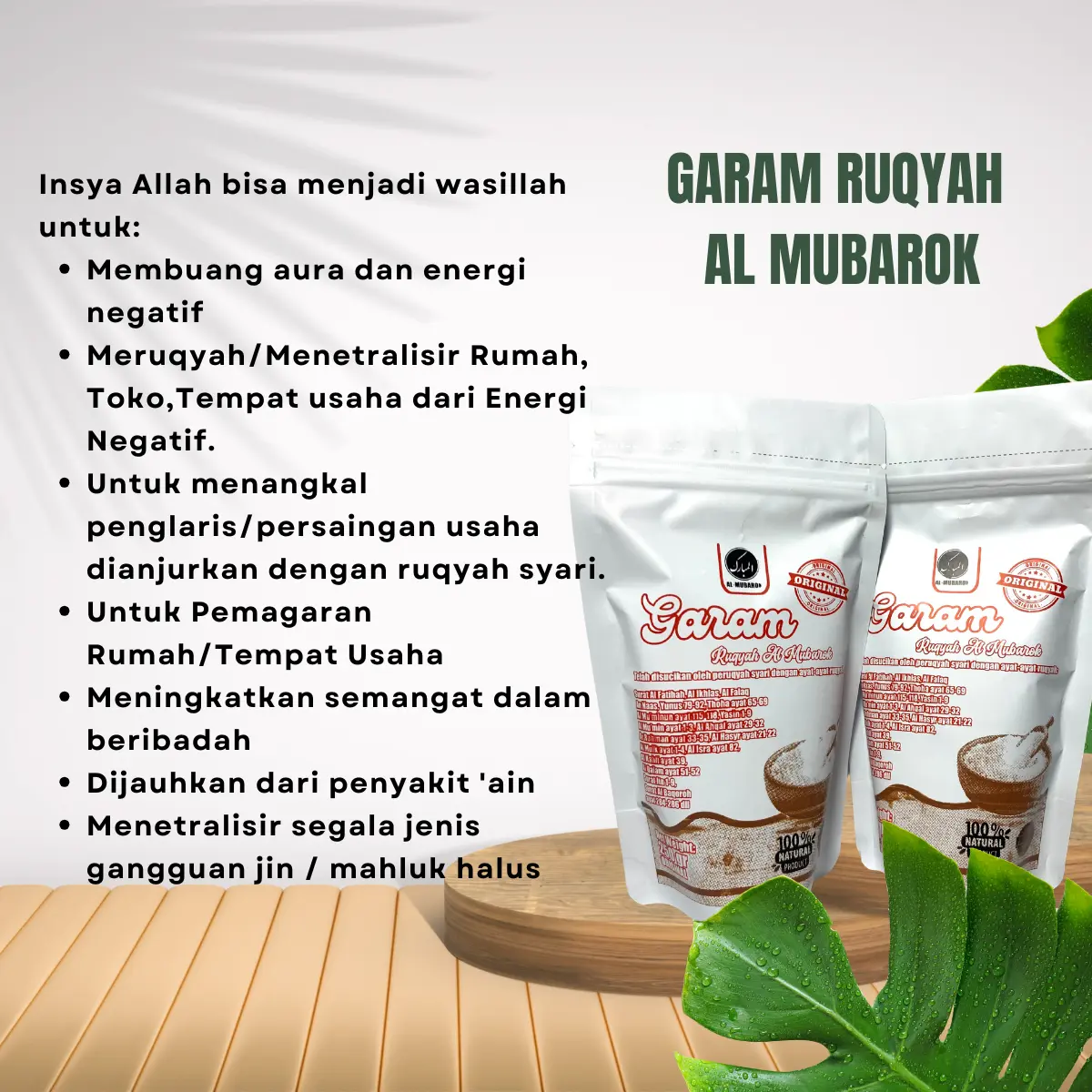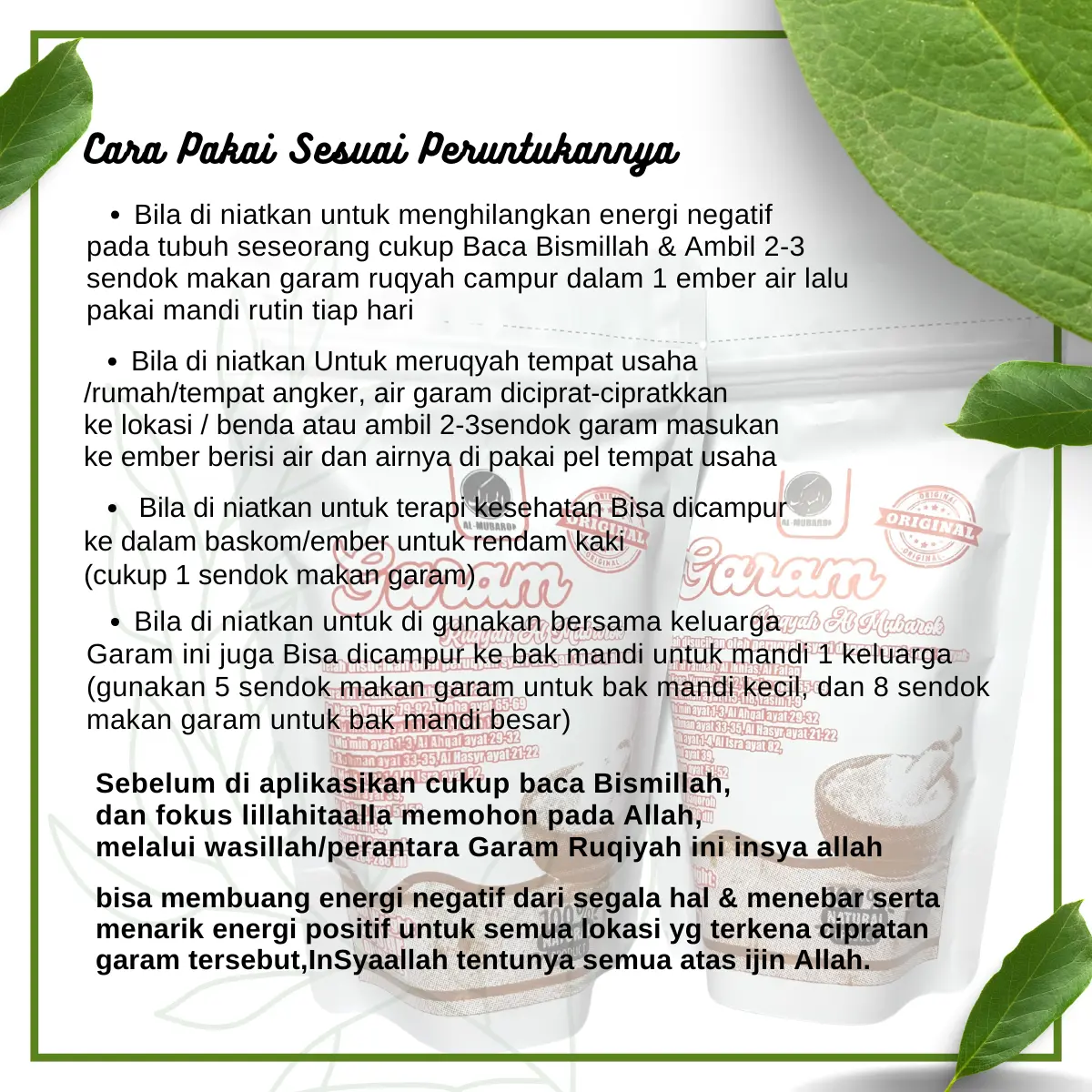 ·Bersama keluarga: Campurkan 5-7 sendok Garam Ruqyah dalam 1 bak air, gunakan untuk mandi setiap hari.