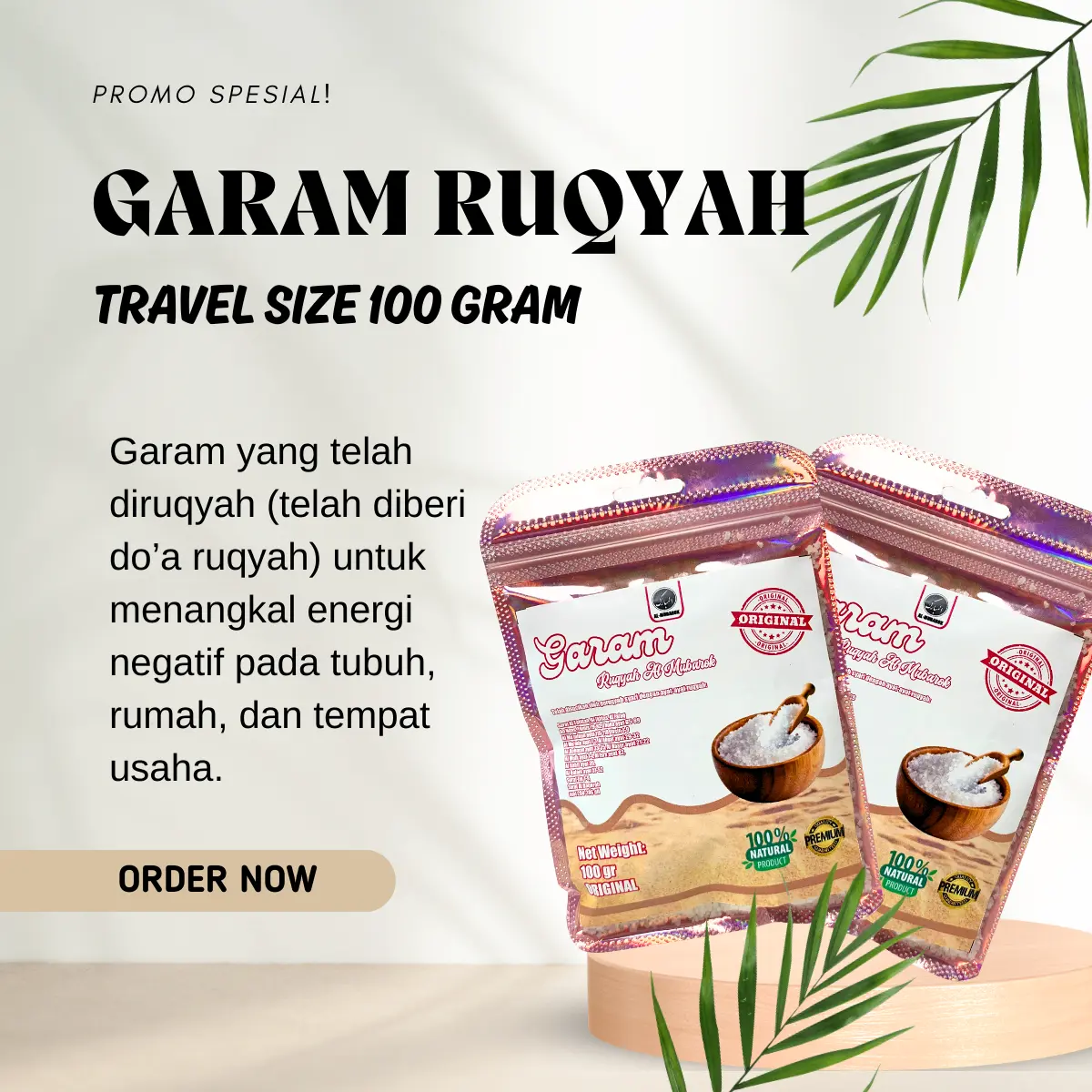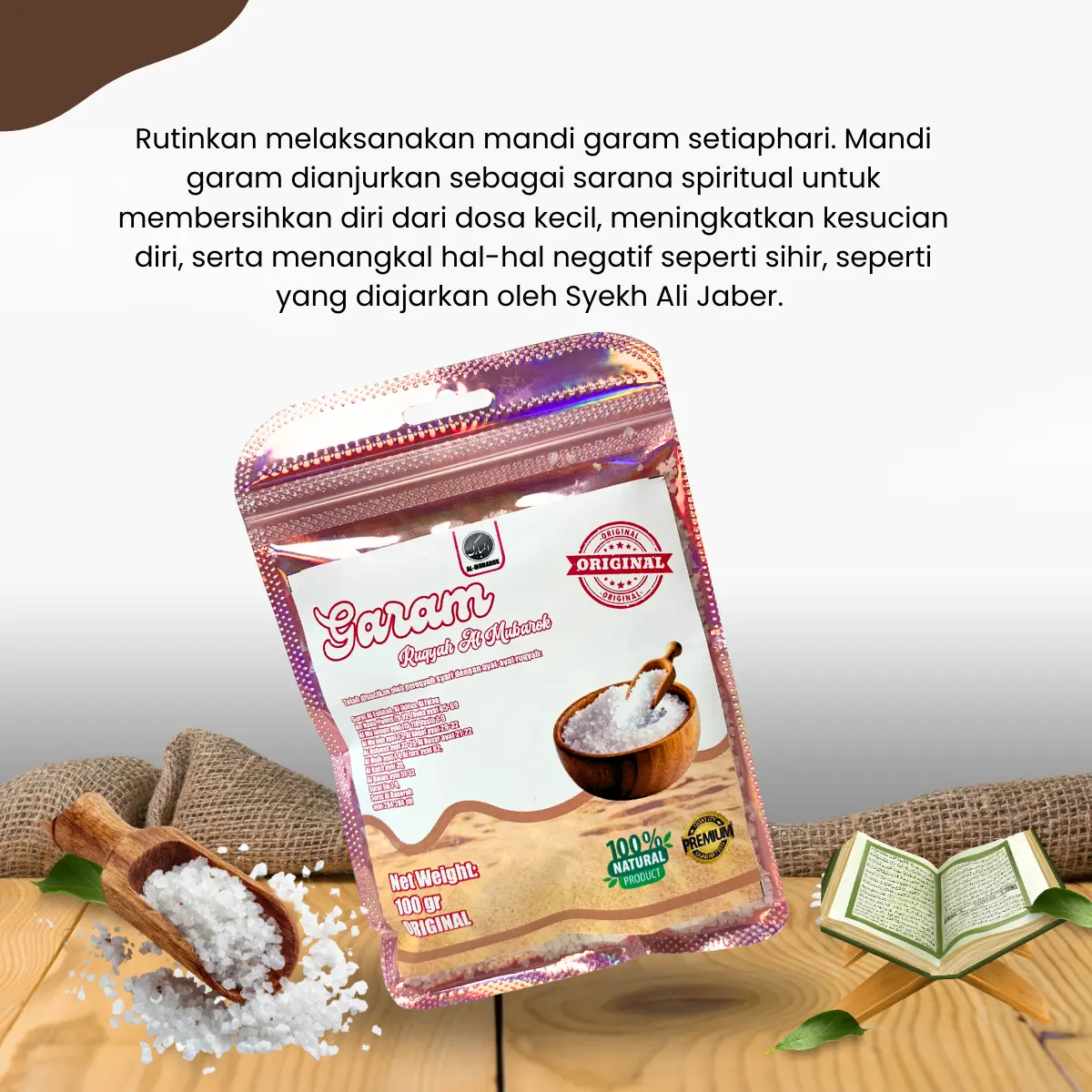 ·Diri: Campurkan 2-3 sendok Garam Ruqyah dalam 1 ember air, gunakan untuk mandi setiap hari.