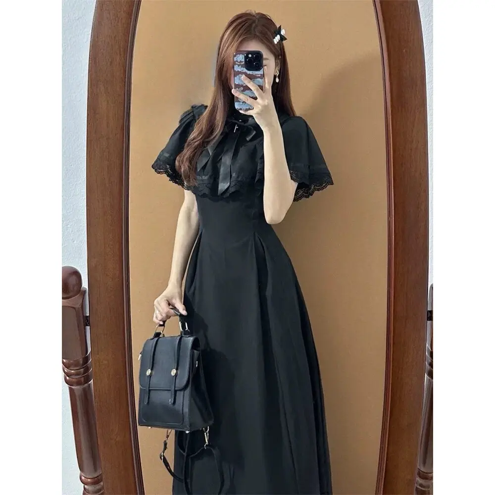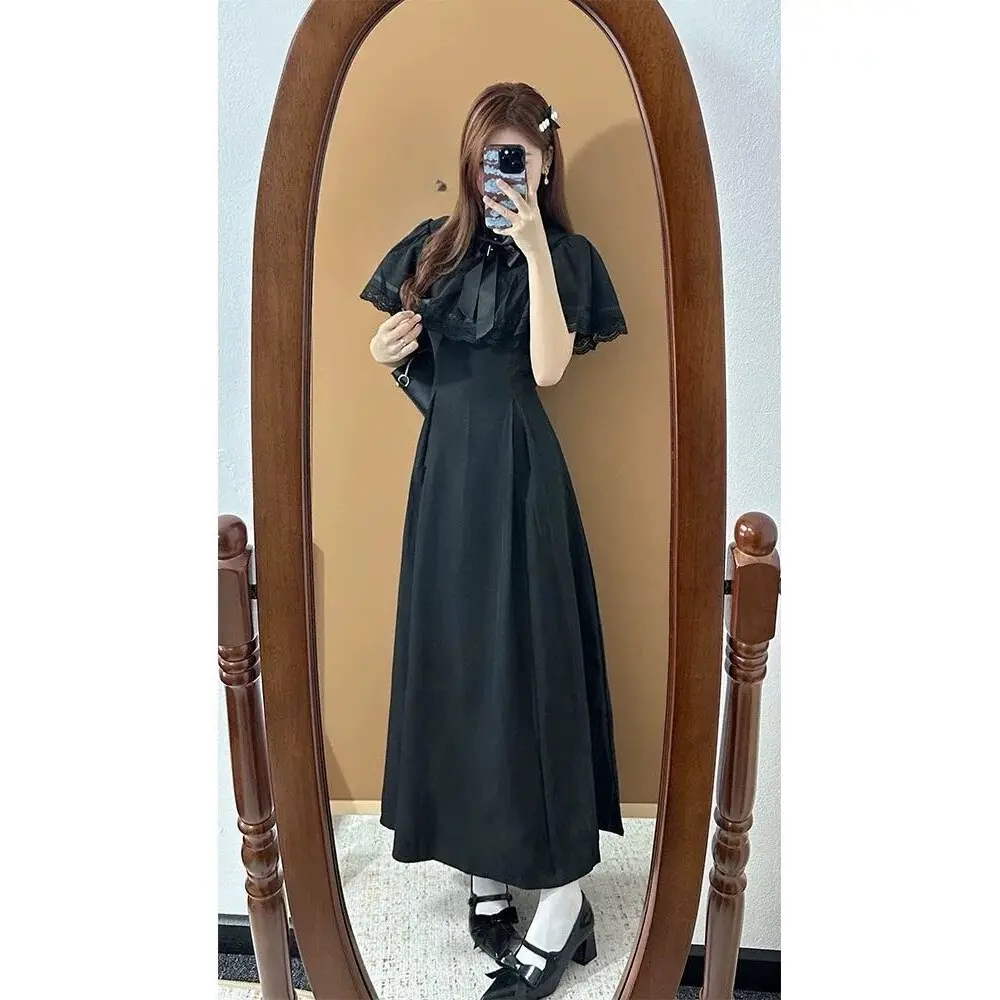 CHICMORE Gaun maxi lengan pendek dengan pita cantik di kerah warna solid elegant