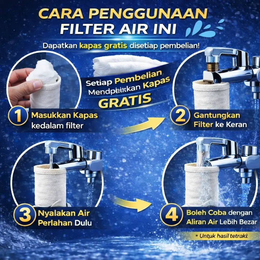 Filter keran air praktis bikin air jadi jernih. Kami menjual filter kran air yang dapat menyaring kotoran dalam air, membuat air lebih bersih dan sehat. Filter ini dapat menyaring air dari bau karat, kuning, lumut, jentik nyamuk, pasir, dan partikel kotor lainnya.