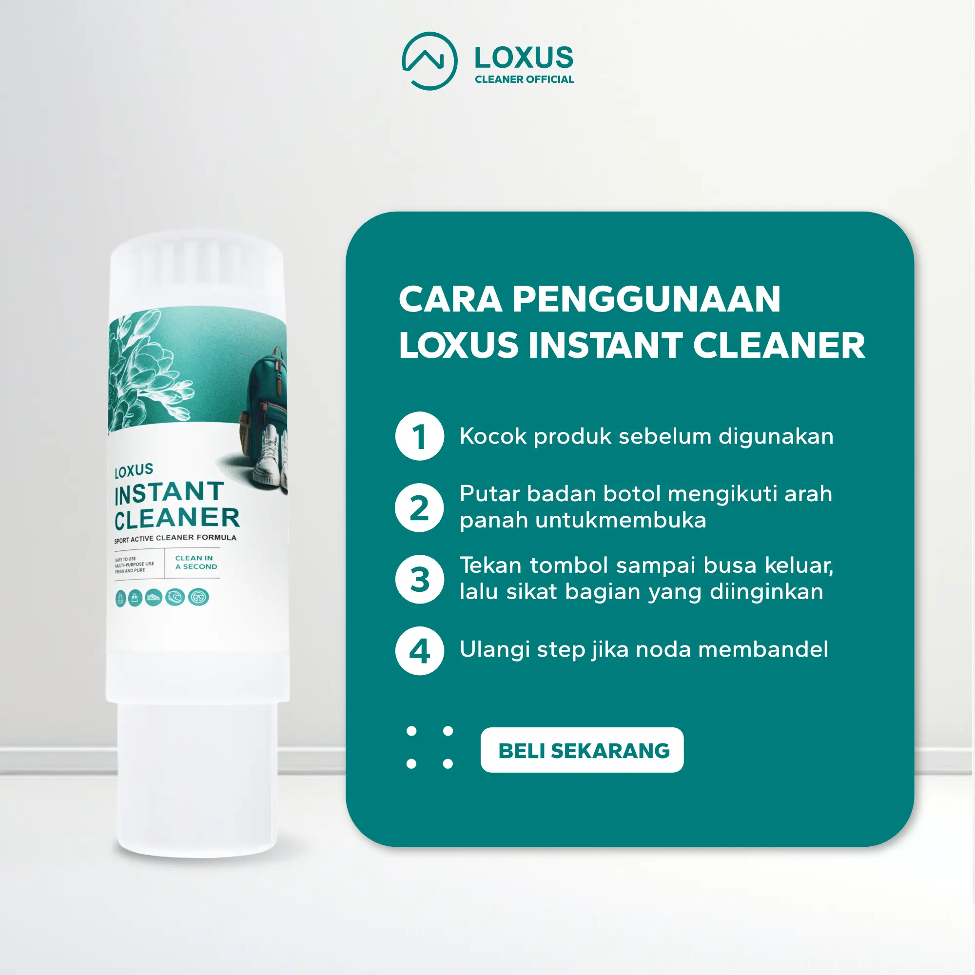 Loxus Instan Cleaner ini merupakan Produk Pembersih dengan MEDIA BUSA sehingga dapat mengikat noda/kotoran hilang total dengan efektif tanpa air dan tanpa di jemur.