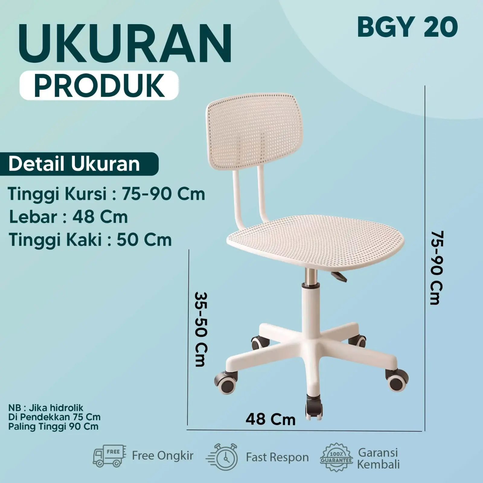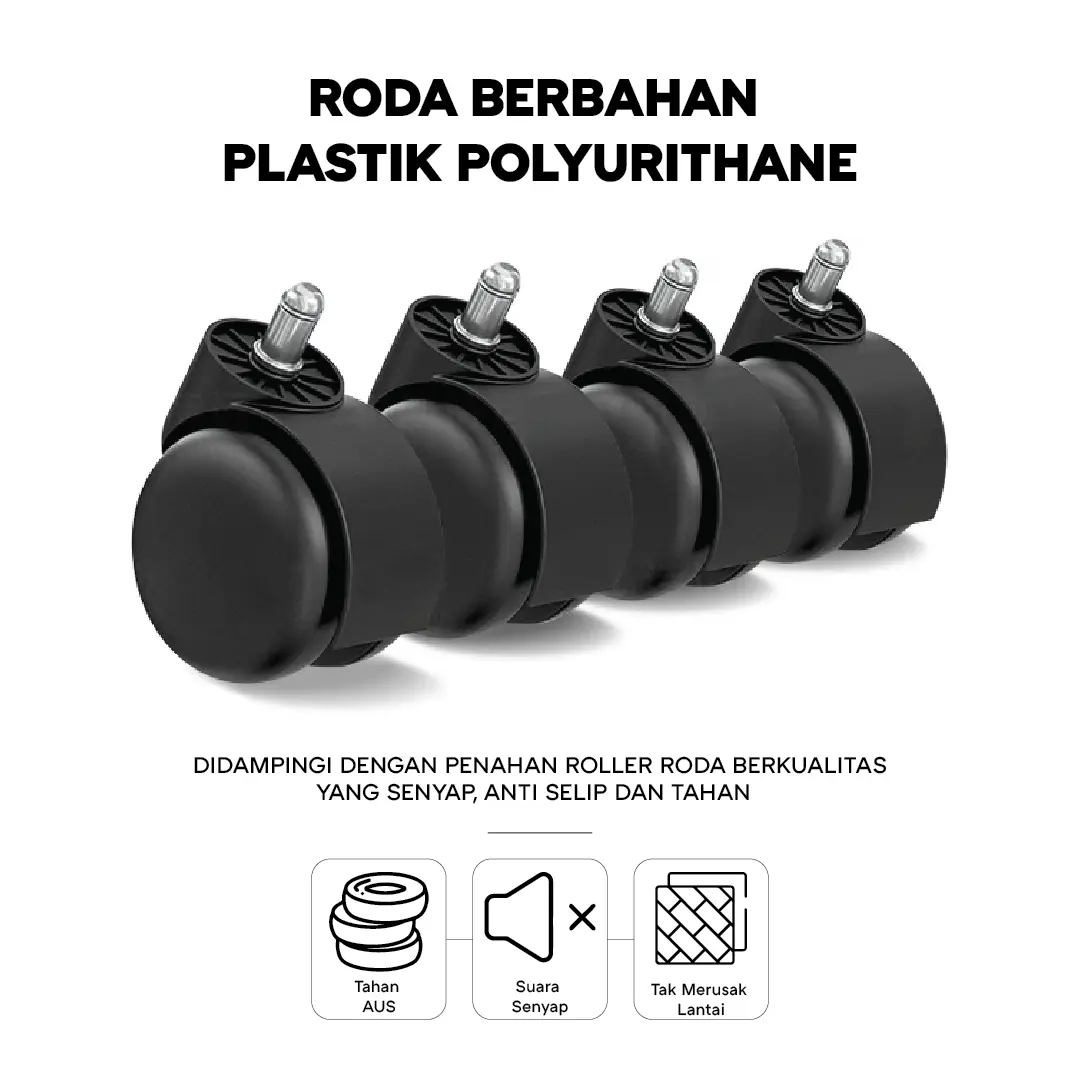 Fitur: Adjustable height, roda 360°, sandaran ergonomis