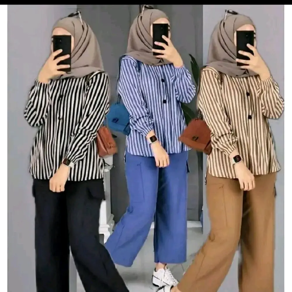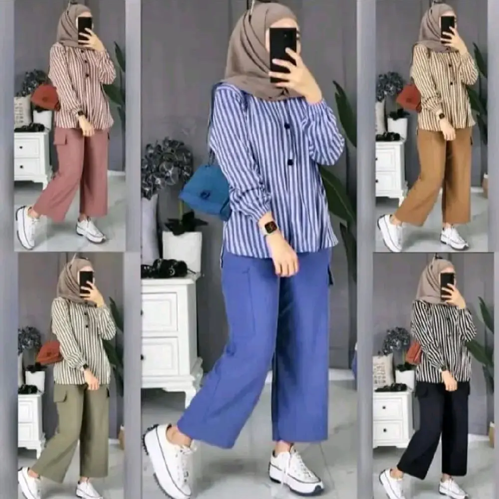 5. RAMOSA ONE SET SETELAN WANITA CANTIK ONE SET MOTIF SALUR KEMEJA BAHAN KATUN Lembut Remaja Dewasa