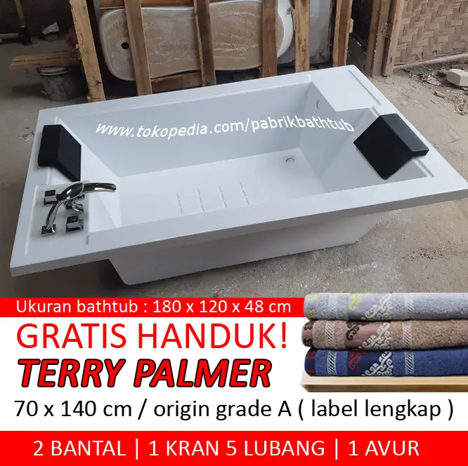 TERMASUK : - HANDUK BATHTUB TERRY PALMER - kran 3 lubang - avur dan 2 bantal SPESIFIKASI PRODUK BATHTUB : - Size 180 x 120 x 48 cm - bahan MARBLE - memiliki kilap lebih terang. - tebal 0,8 sampai 15 mm ACCESSORIES BATHTUB: ( TERMASUK ) - Kran 3 lubang - bantal bathtub polyurethan anti air - avur pop up kuningan SPESIFIKASI HANDUK BATHTUB TERRY PALMER : ( TERMASUK ) Original produk handuk bathtub - GRADE A artinya grade A adalah produk handuk bathtub yang lolos Quality control, dengan ciri Label Lengkap. Apabila handuk bathtub ini tidak lolos QC ( cacat produksi, jahitan kurang rapi dll ) akan dibuang labelnya dan di sale dengan kode GRADE B. Jadi BONUS handuk bathtub disini adalah handuk bathtub terry palmer yg berkualitas grade A. Lolos QC dan Lengkap dengan Label terry palmer origin. Varian Handukbathtub EXCELLENT By Terry Palmer dengan desain tebal,mewah dan material Cotton terbaik Handuk bathtub ini terbuat dari 100% dari COMBED katun - Size 70 x 140 cm HARGA JADETABEK
