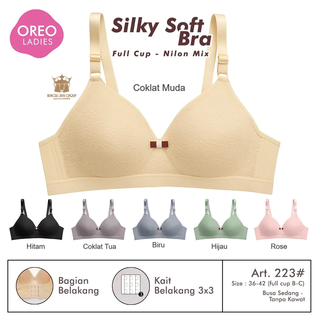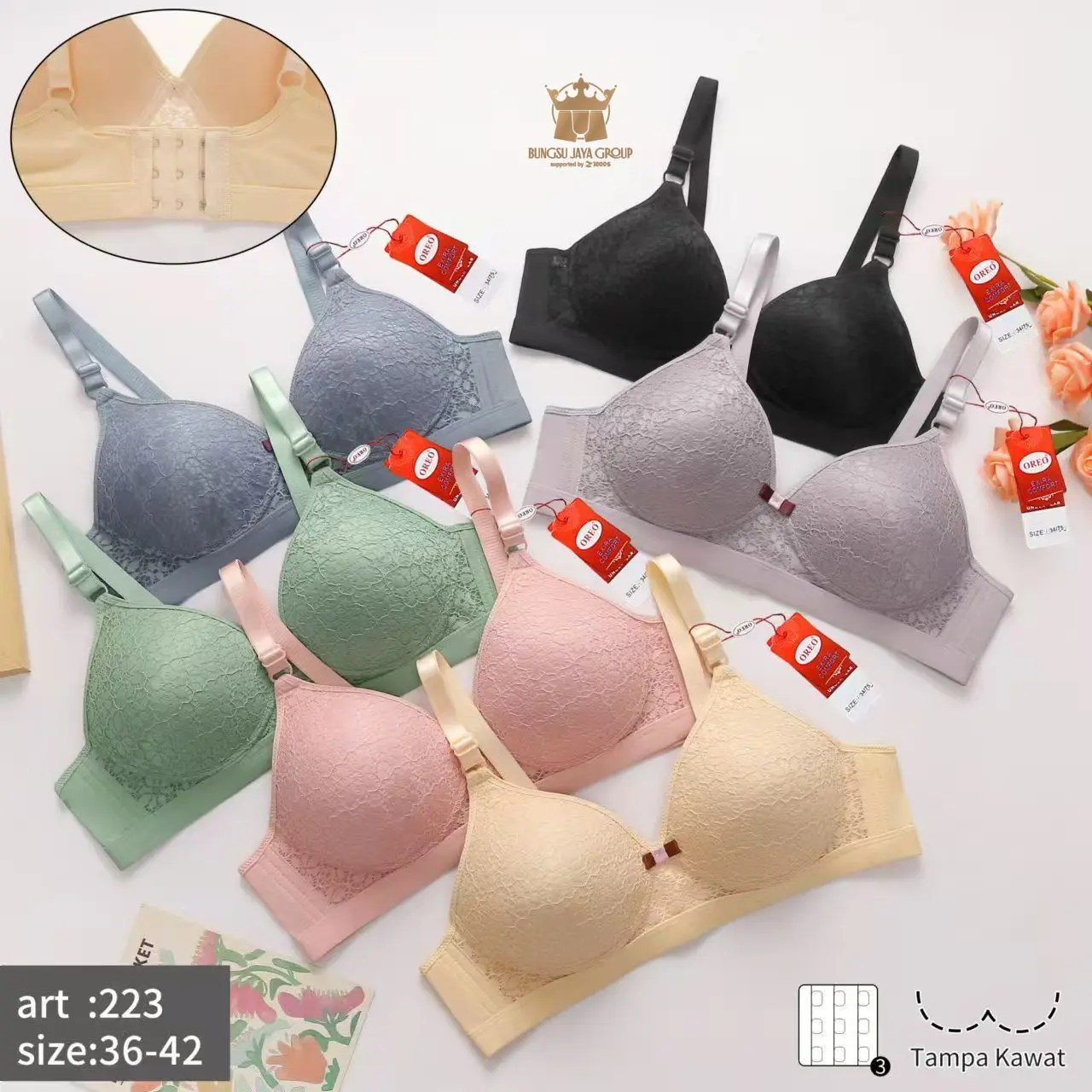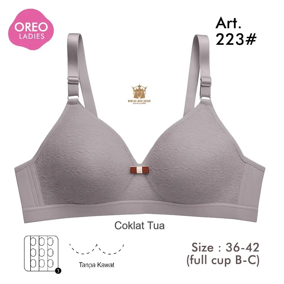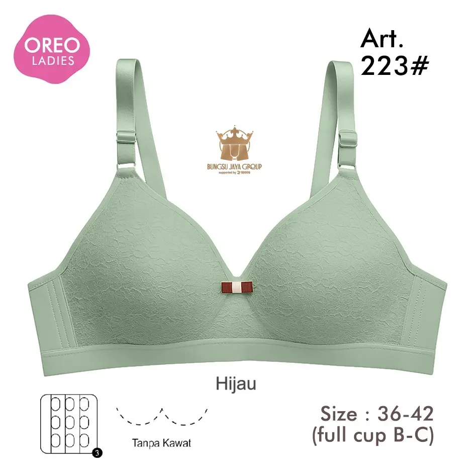Bra Oreo Art 223 (promo 3pc) Bh Motif Renda Busa Sedang Tanpa Kawat Full Cup B-C Nilon Mix Lembut Nyaman Wanita Dewasa