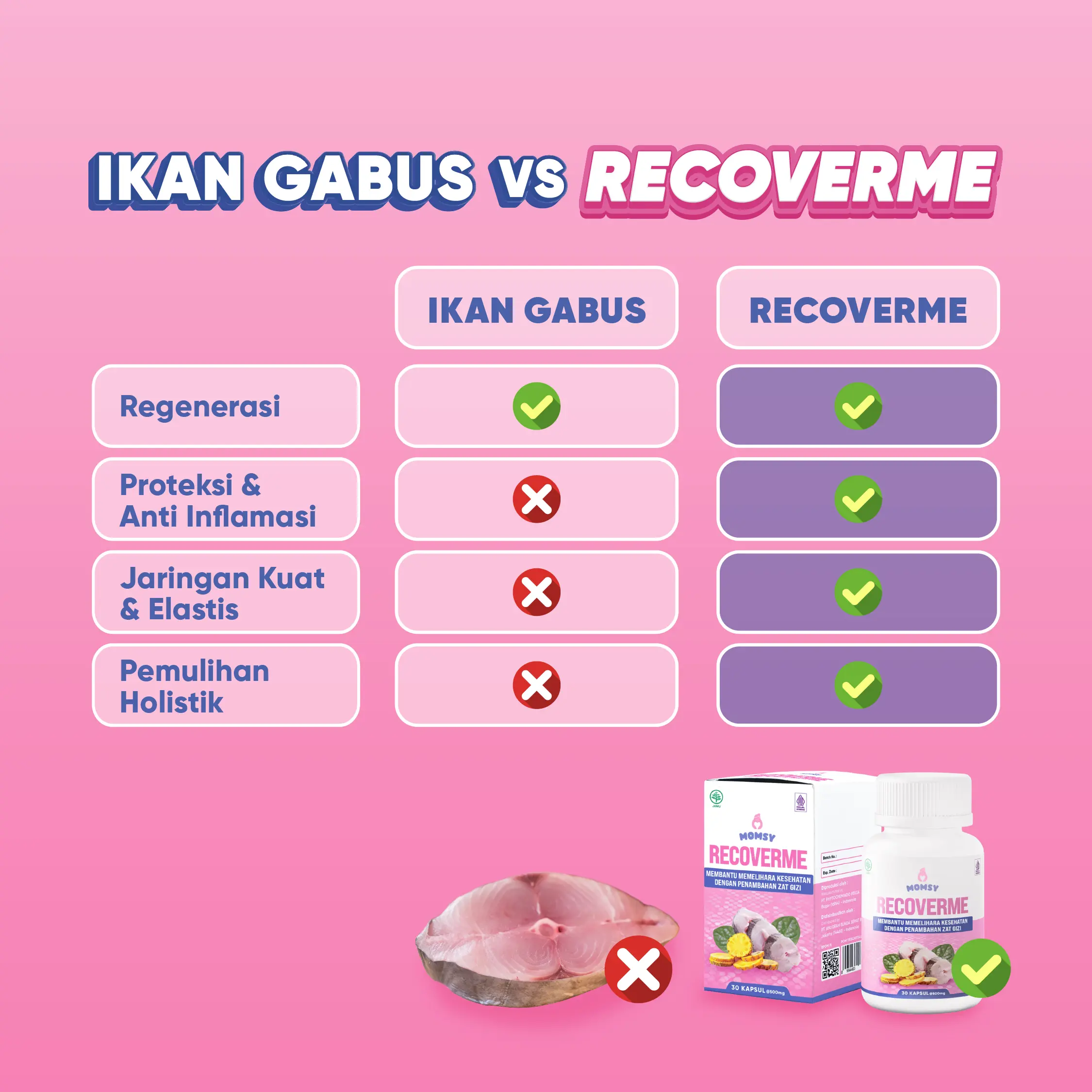 Recoverme merupakan #1st Herbal Formula di Indonesia dengan kombinasi 3 Bahan Aktif Alami (Ikan Gabus, Daun Binahong & Enzim Bromelain) yang diformulasikan khusus untuk membantu pemulihan luka dari dalam tubuh.