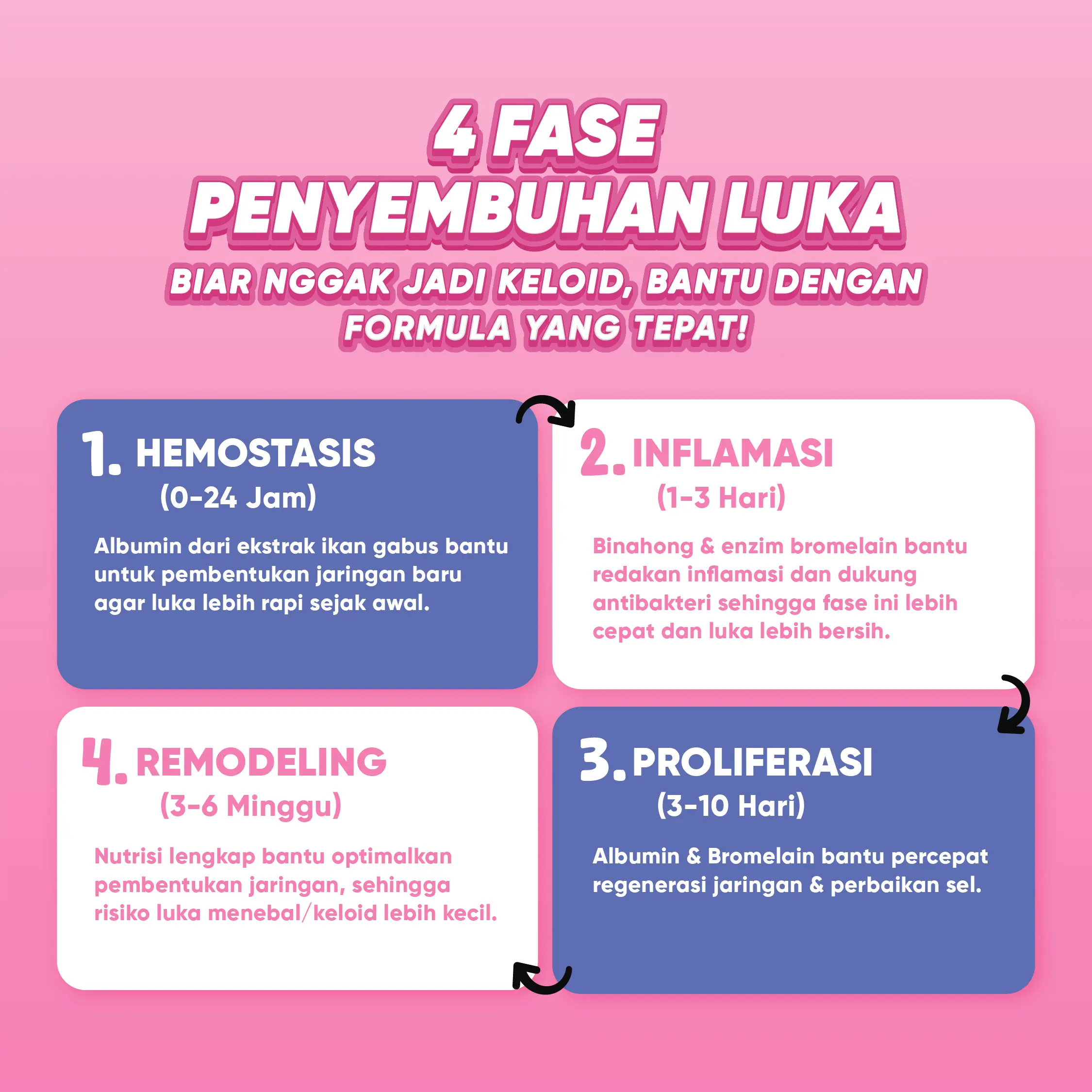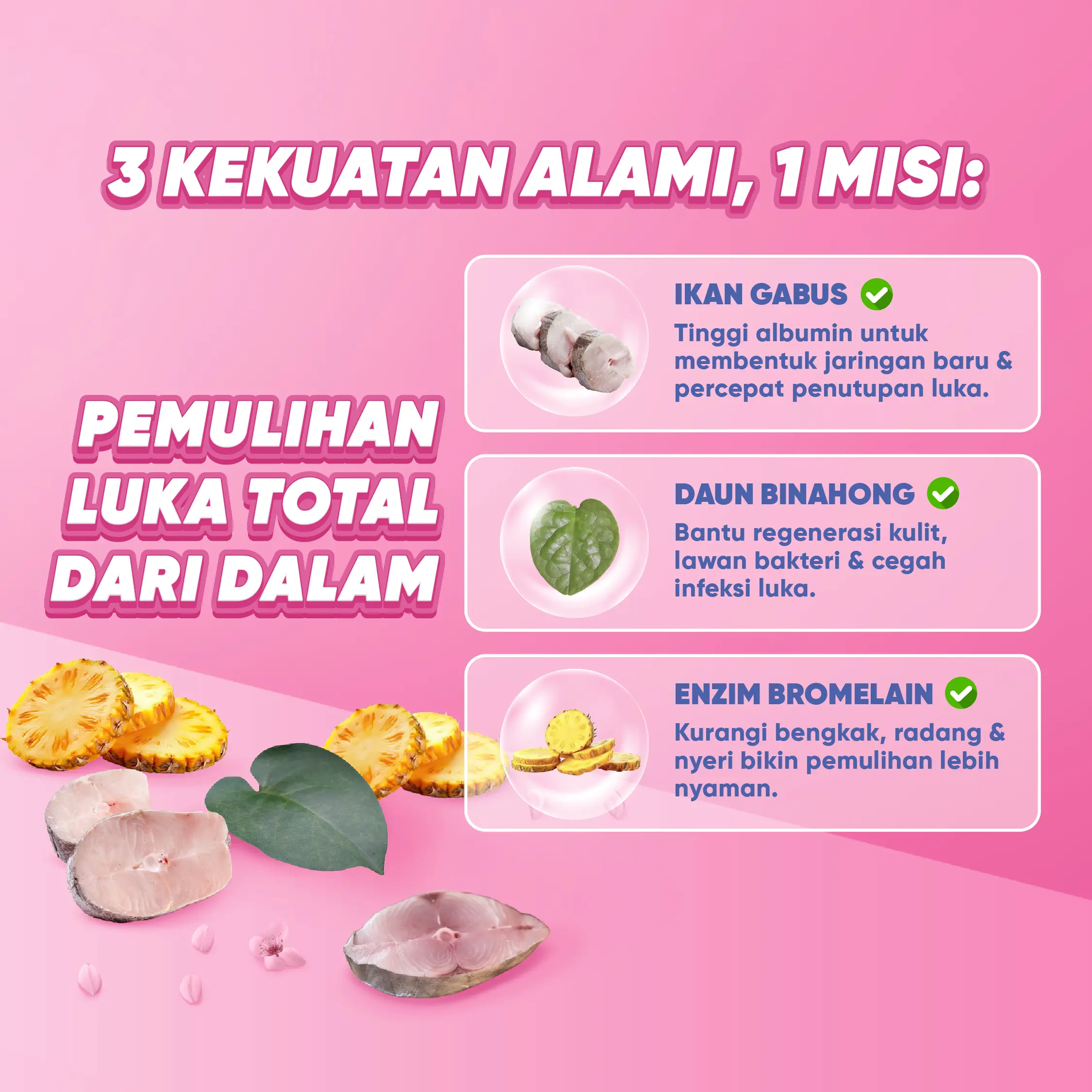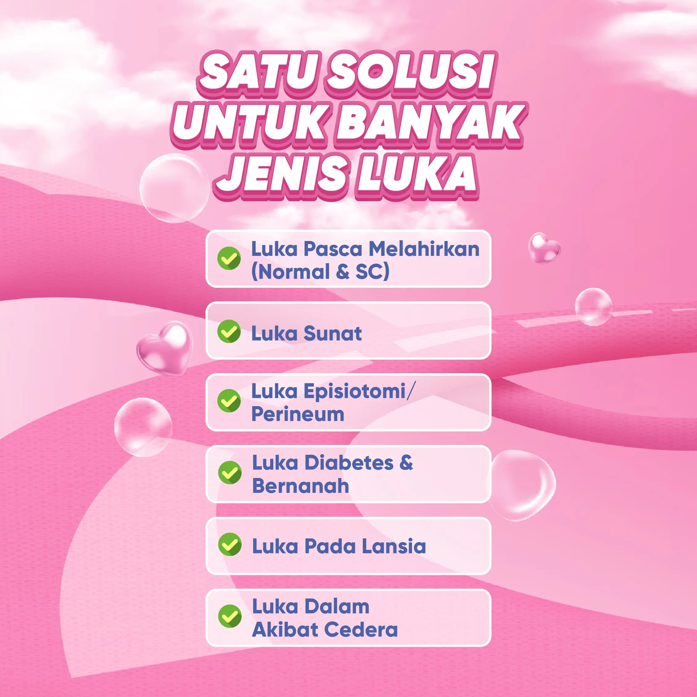 Dirancang untuk ibu pasca melahirkan (normal/SC), luka jahitan, luka operasi, hingga luka infeksi agar pulih lebih cepat, lebih bersih, dan lebih kuat.