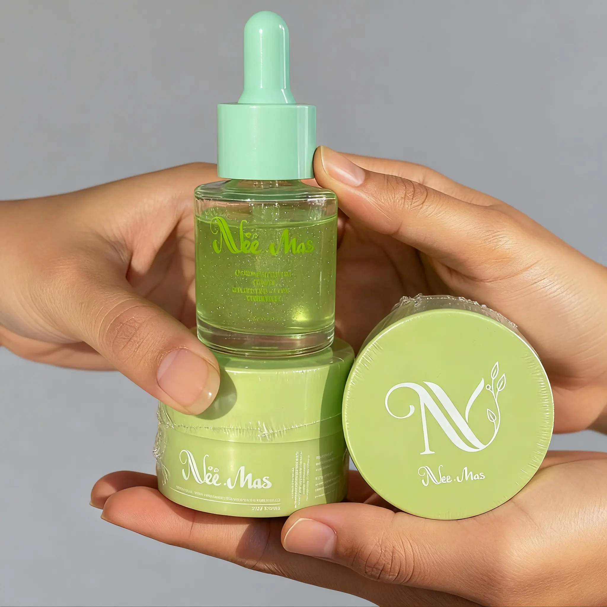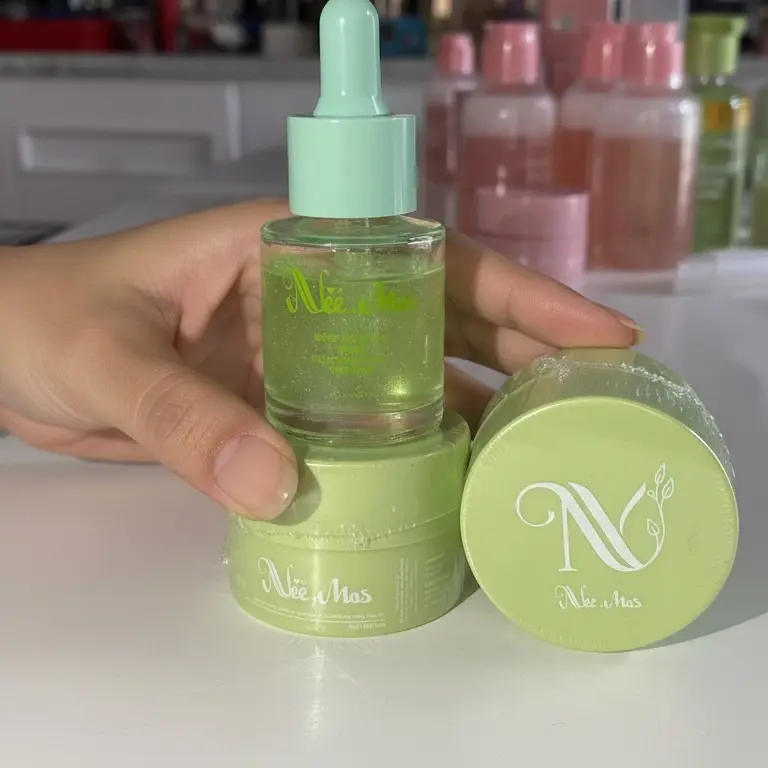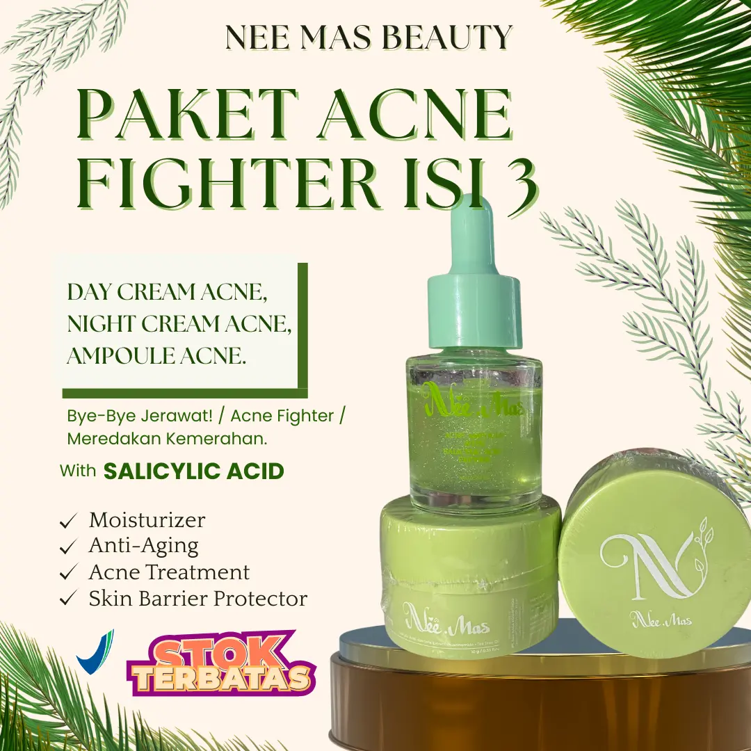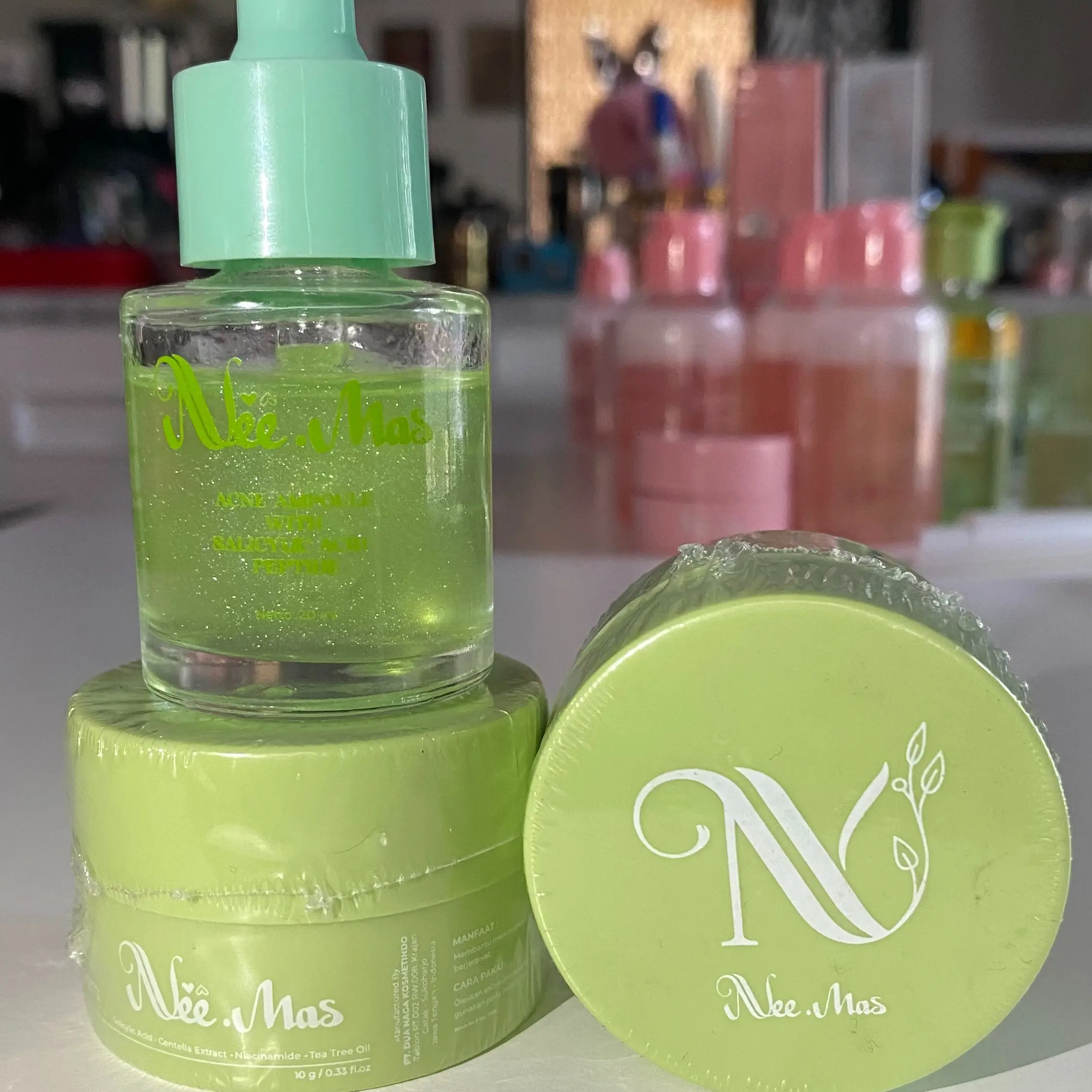 Nee.Mas Acne Skin Series hadir dalam paket isi 3: Day Cream, Night Cream, dan Ampoule dengan asam salisilat. Paket ini dirancang untuk mengatasi masalah jerawat dan meredakan kemerahan.