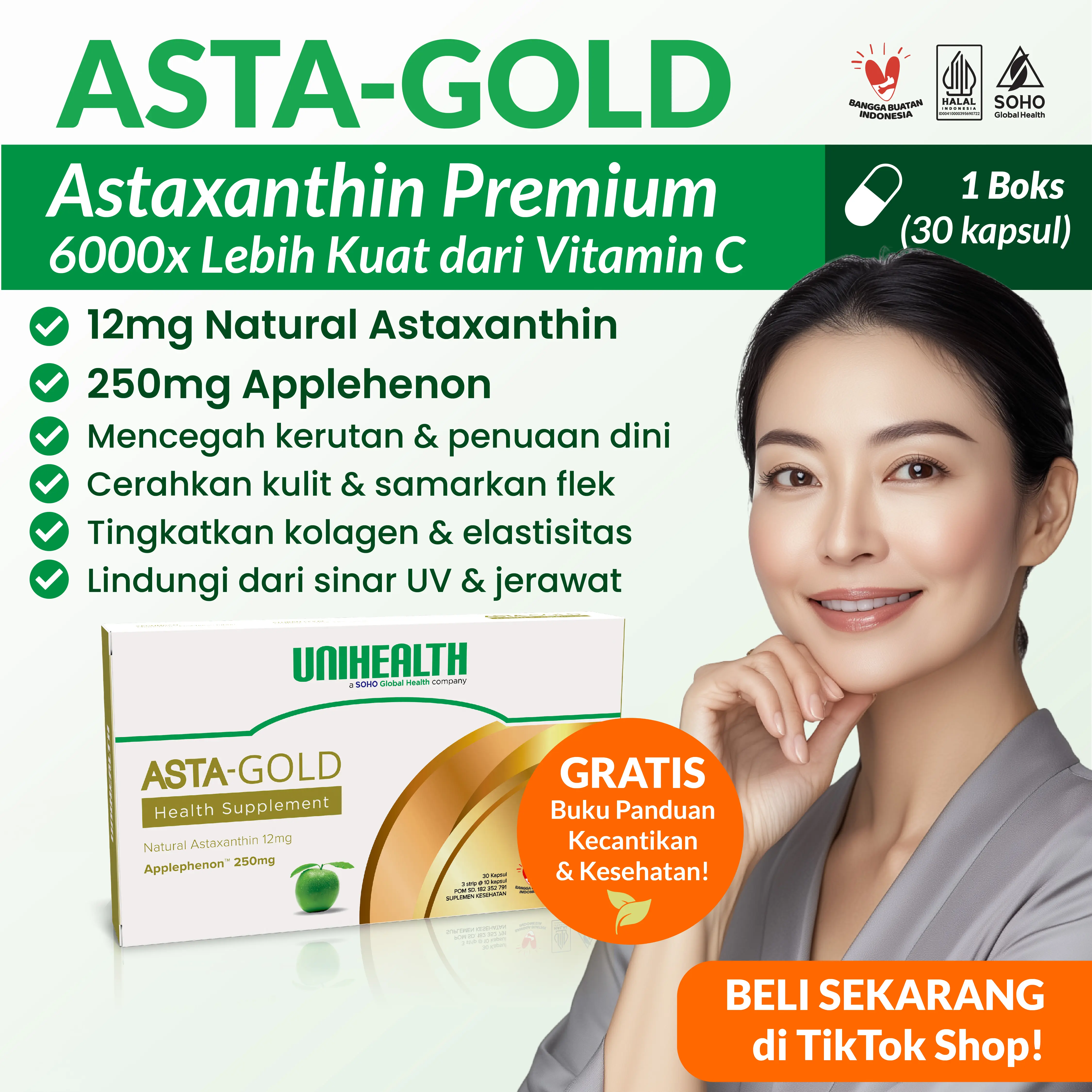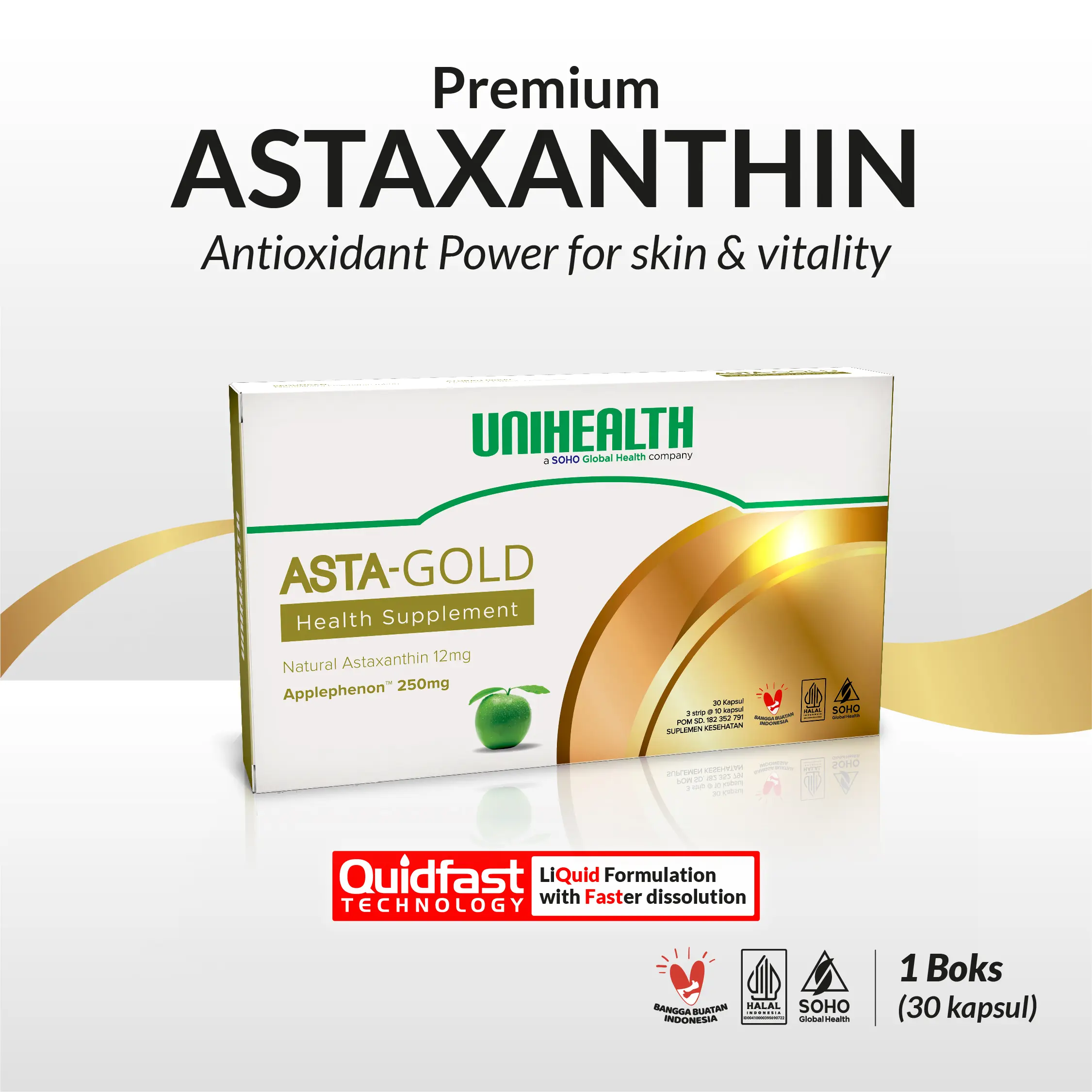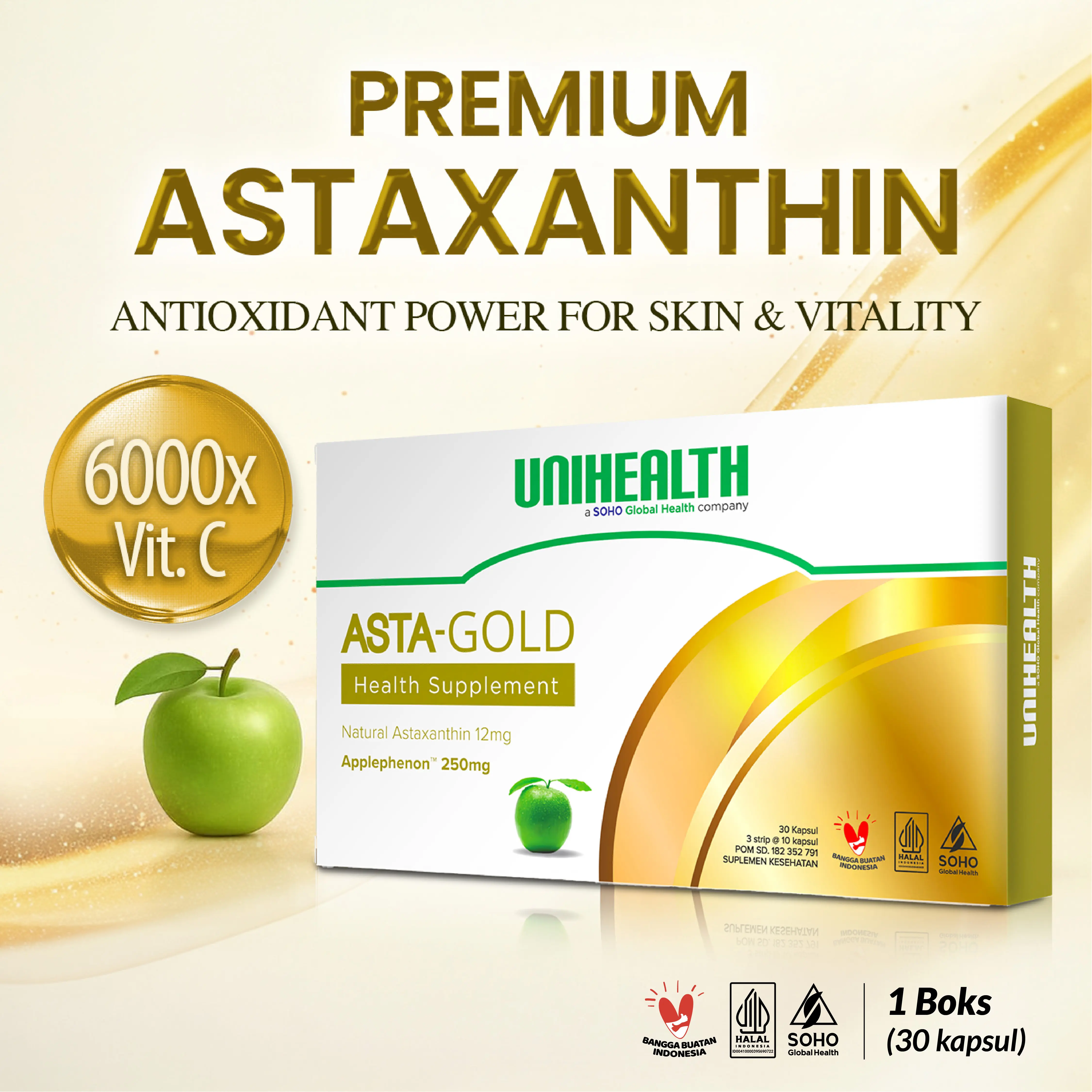 ASTA-GOLD adalah kombinasi Astaxanthin 12mg dan Applephenon 250mg, dua antioksidan kuat yang bekerja sinergis untuk melindungi kulit dari radikal bebas, mencerahkan, dan memperlambat tanda-tanda penuaan.