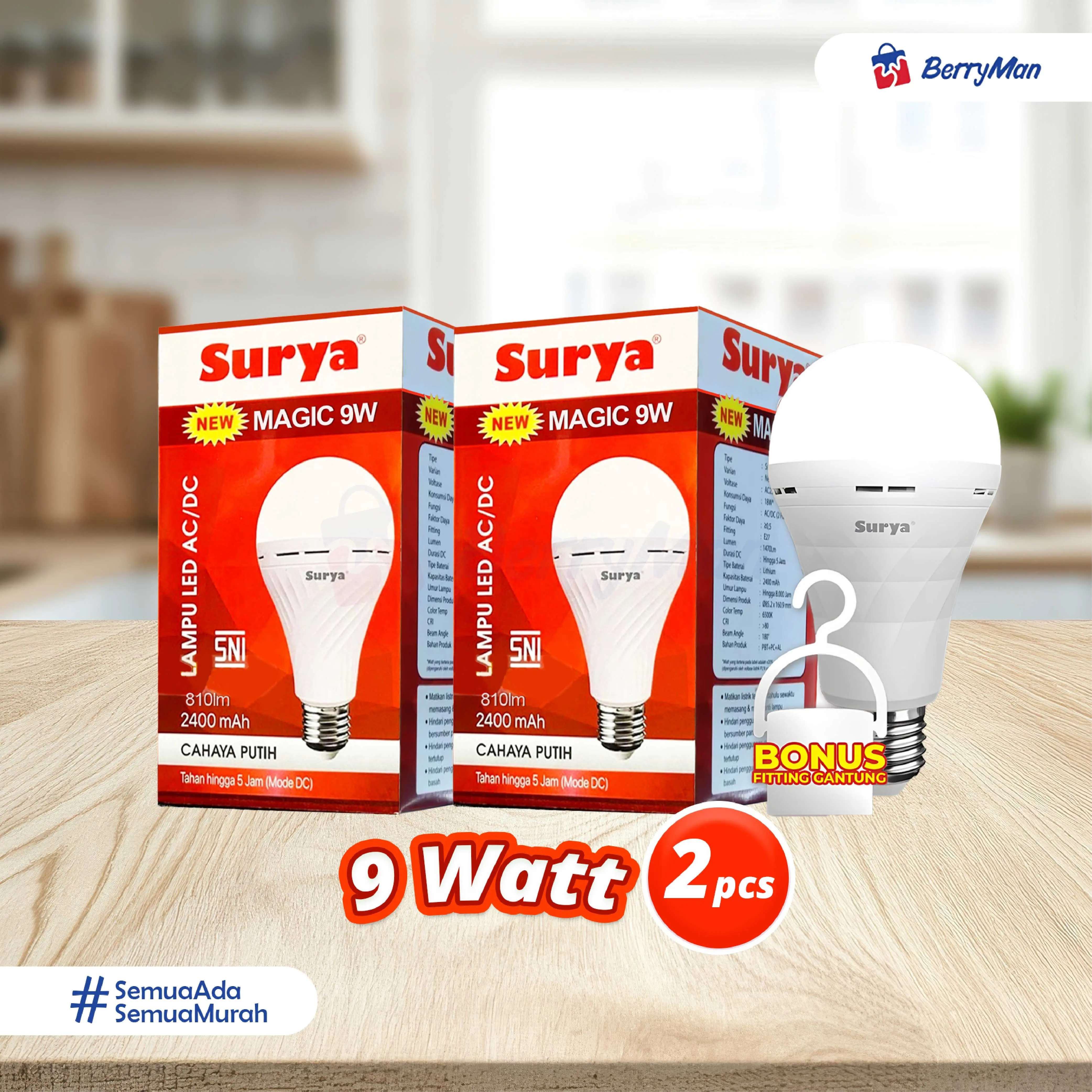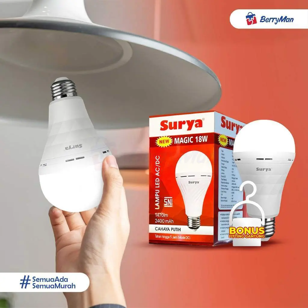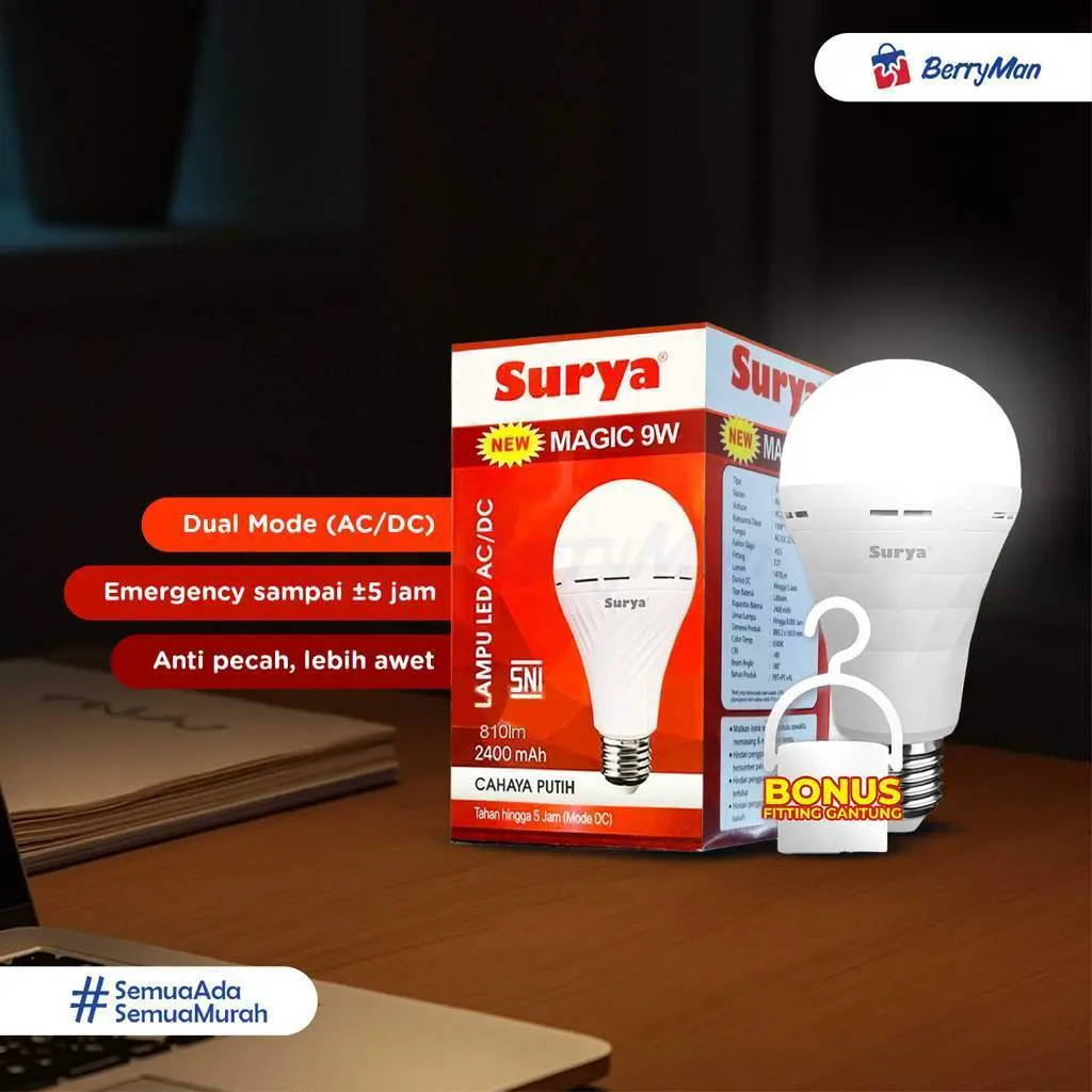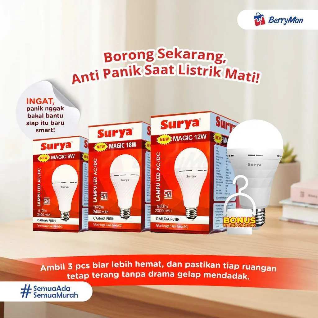 Hemat lebih banyak dengan Paket Isi 3 Pcs Surya Magic II, lampu bohlam emergency pintar yang otomatis menyala saat listrik padam. Dilengkapi teknologi AC DC Auto Nyala, lampu tetap berfungsi seperti biasa ketika listrik menyala, dan langsung beralih ke mode emergency menggunakan baterai internal ketika listrik mati.
