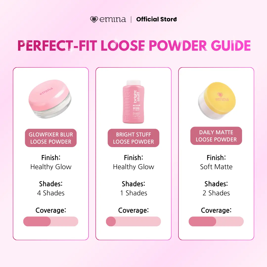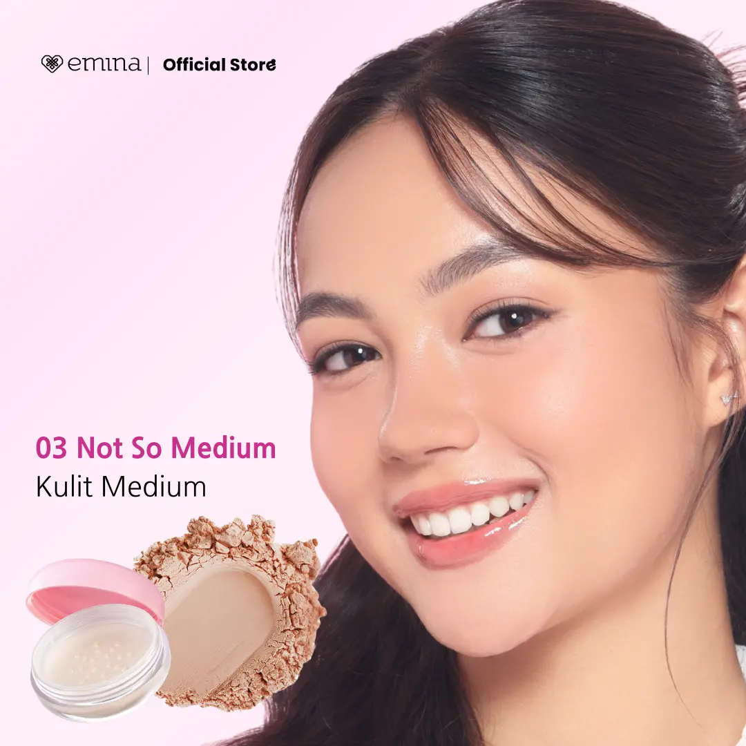 New! Emina Glowfixer Blur Powder, loose powder dengan hasil blur & hydrating barrier yang cocok untuk semua jenis kulit, termasuk kulit berjerawat (acne or breakout skin), kering, dan sensitif. Mengandung 3x Hybrid Barrier Serum & Complexion yang terdiri dari Swiss-grade Niacinamide untuk mengontrol sebum dan menjaga hidrasi, Tranexamic Acid untuk membantu mencerahkan noda hitam, serta Actinidia Polygama yang membantu membuat kulit tampak lebih cerah dan translucent. Dengan SPF 20 PA+++. Memiliki formula yang memberikan perlindungan ringan dari sinar UV. Loose powder ini memberikan hasil akhir second-skin dengan micro powder yang ringan, halus, serta crack-proof, sweat-proof, dan flashback-proof.