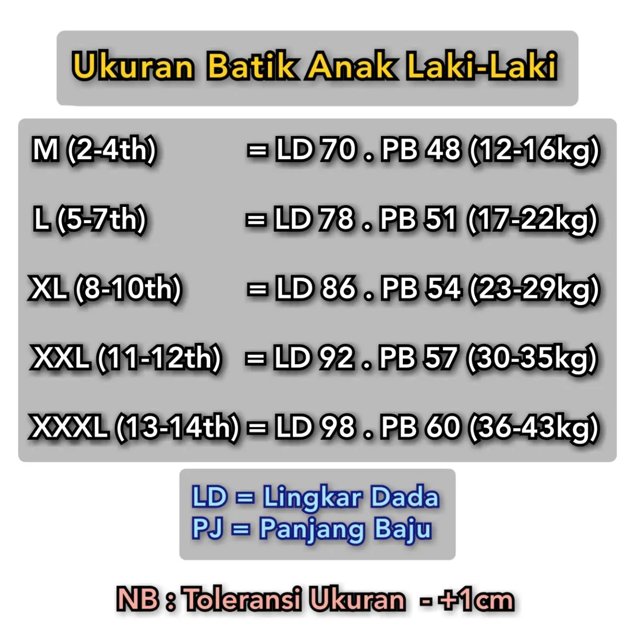 LD = Lingkar Dada, PB = Panjang Badan. Toleransi pengukuran Β±1 cm.