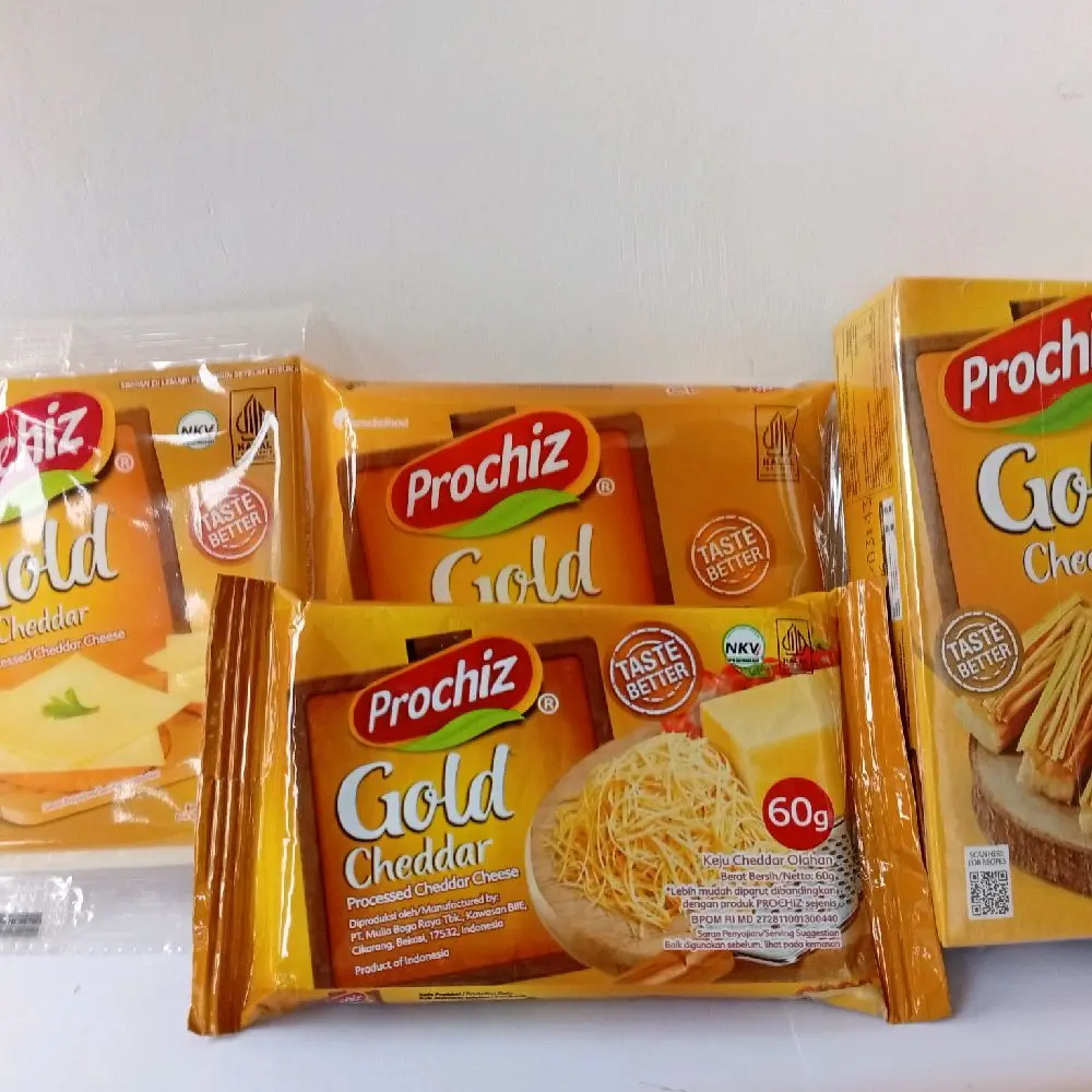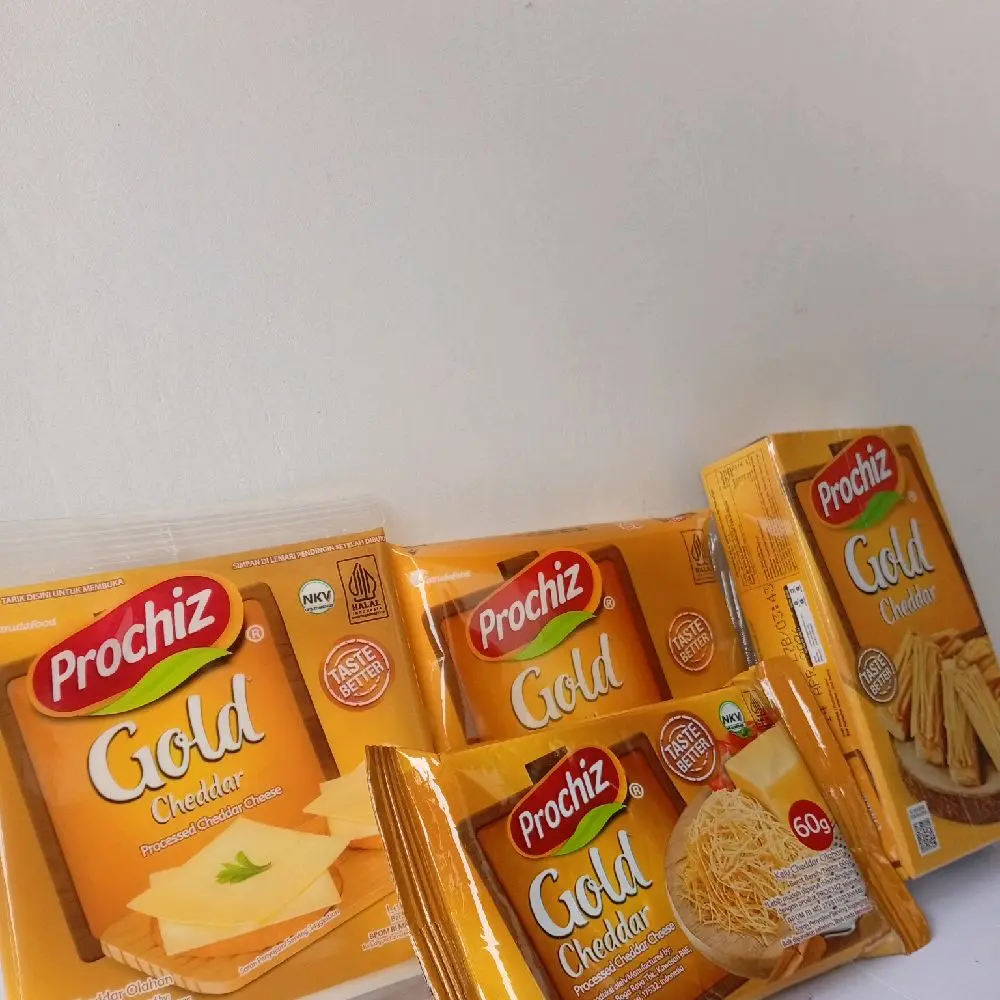 Prochiz Keju Cheddar Gold dan Slice kemasan 60g, 160g dan slice isi 2, 12 lembar. 🧀 Pilih kemasan yang sesuai dengan kebutuhan Anda. Ketersediaan dalam kemasan 60g dan 160g memberikan fleksibilitas. Slice isi 2, 12 lembar menawarkan pilihan yang praktis. Cocok untuk berbagai keperluan.