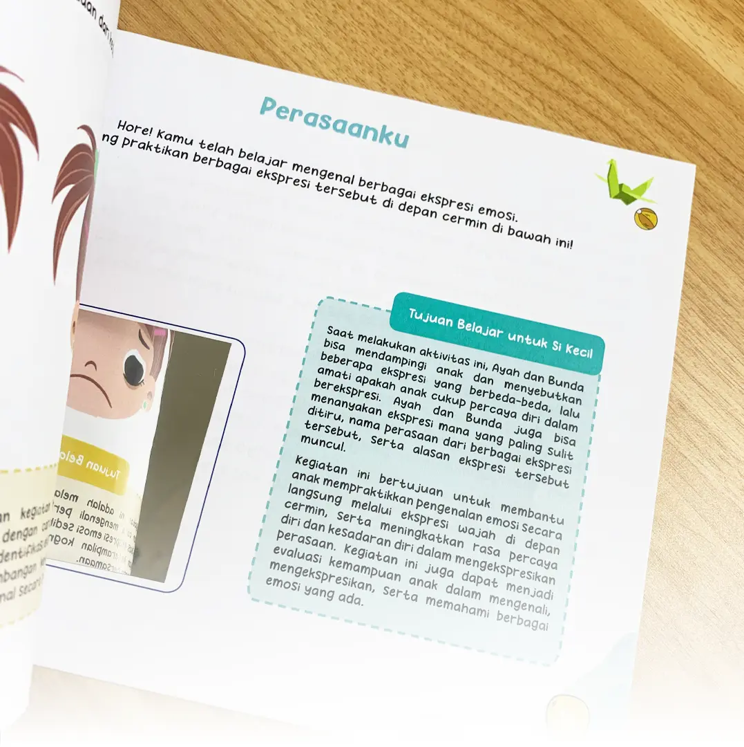 Buku ini membantu Ayah dan Bunda mengenalkan berbagai perasaan melalui aktivitas mewarnai, mencocokkan gambar, hingga berekspresi di depan cermin. Dengan cara sederhana namun bermakna, anak belajar memahami diri, berempati pada orang lain, dan lebih percaya diri. Buku ini dapat menjadi sahabat Ayah dan Bunda dalam membersamai tumbuh kembang emosional anak dengan penuh kasih.