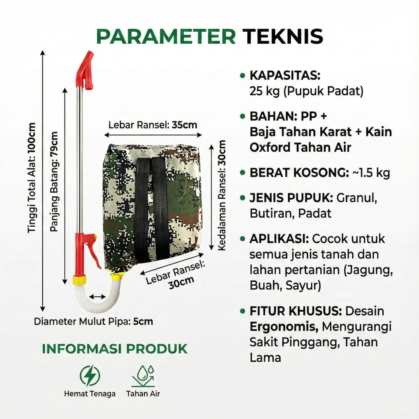 Β·Alat pertanian profesional ini dirancang khusus untuk mempermudah petani mendistribusikan pupuk kering (granular) secara merata dan linier (Tabur Baris) saat berjalan di antara barisan tanaman.