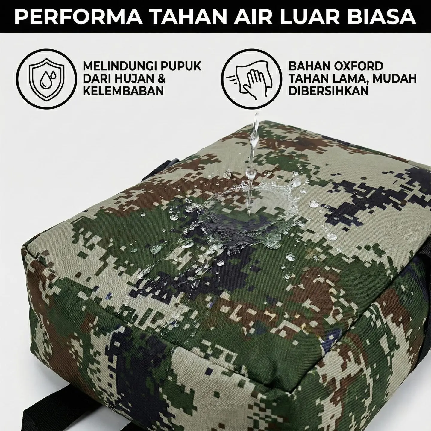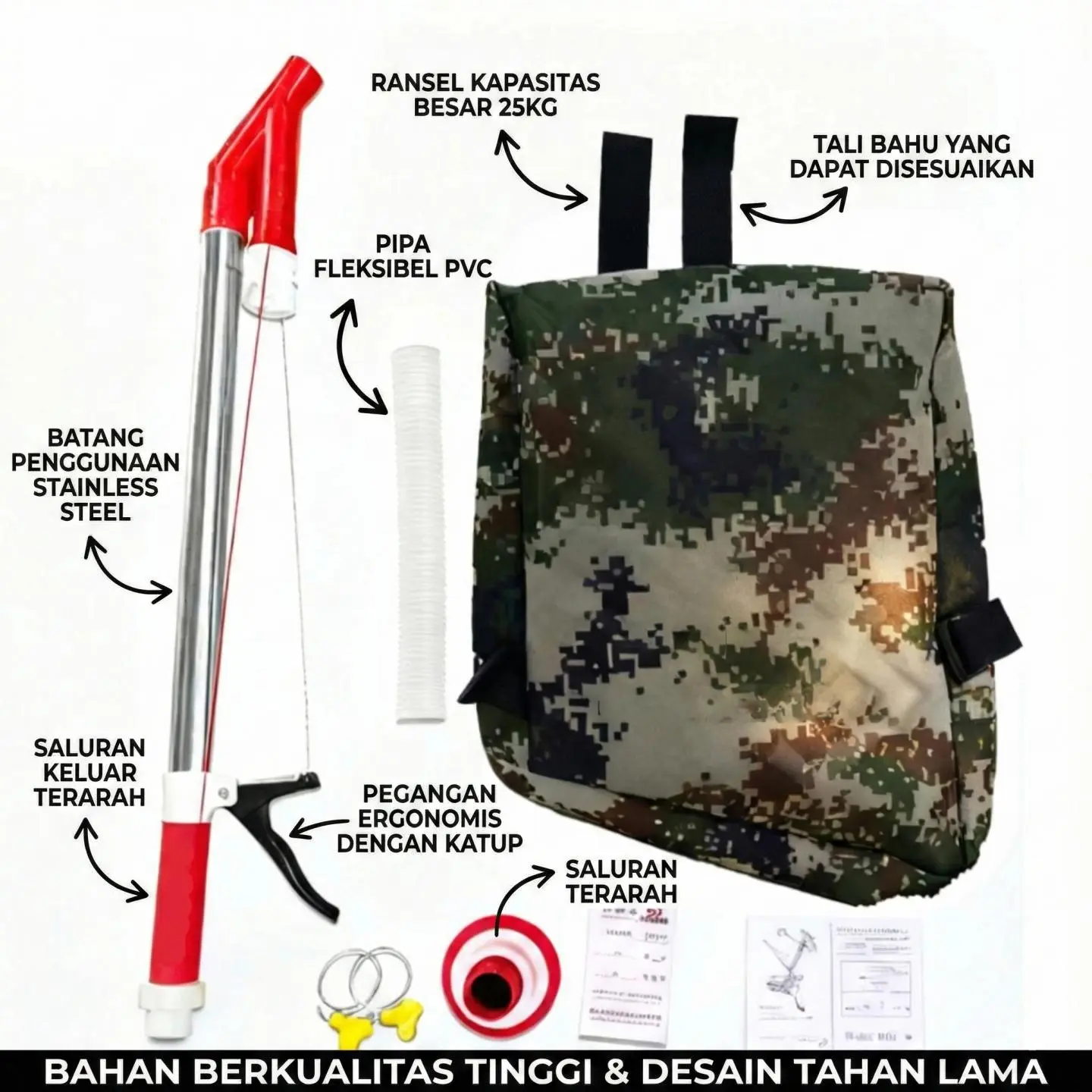BAHAN KUAT & TAHAN LAMA Tas terbuat dari bahan kain yang kuat, dan alat pengocoran/penabur terbuat dari campuran plastik PVC dan tongkat baja, menjamin ketahanan untuk penggunaan di lapangan.