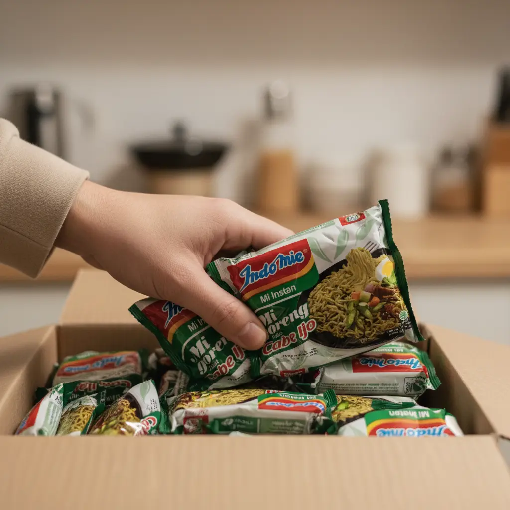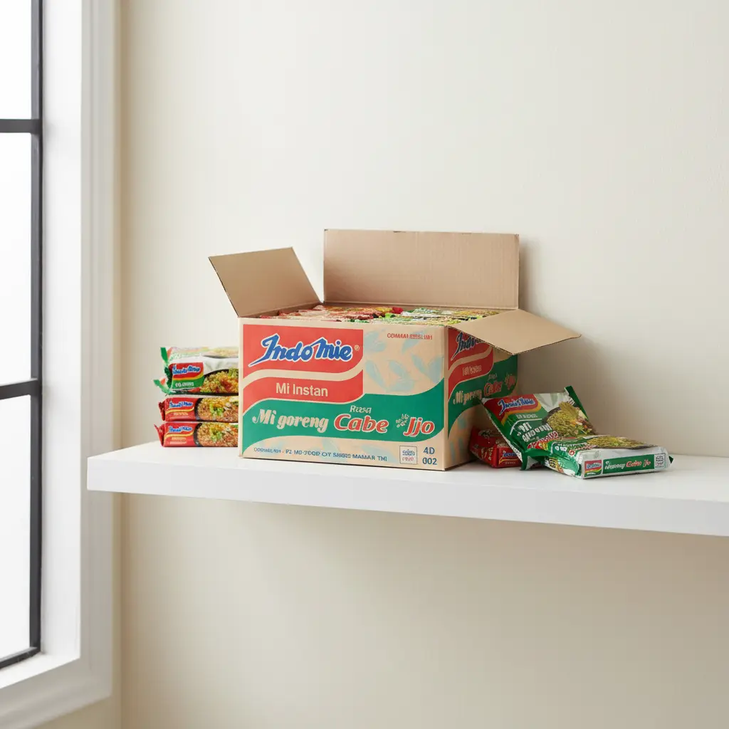 ✨ Isi & Kuantitas: 1 dus berisi 40 bungkus mie instan. Berat & Dimensi Dus: ± 4,1 kg – 5,0 kg per dus (tergantung batch/pemasok). Ukuran Kemasan Dus: Sekitar 30 cm × 30 cm × 30 cm, atau 40 cm × 30 cm × 30 cm tergantung pemasok.