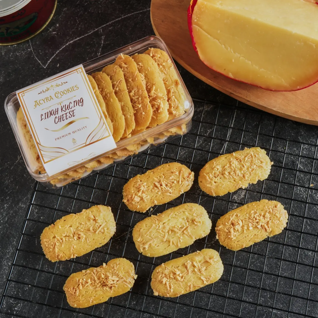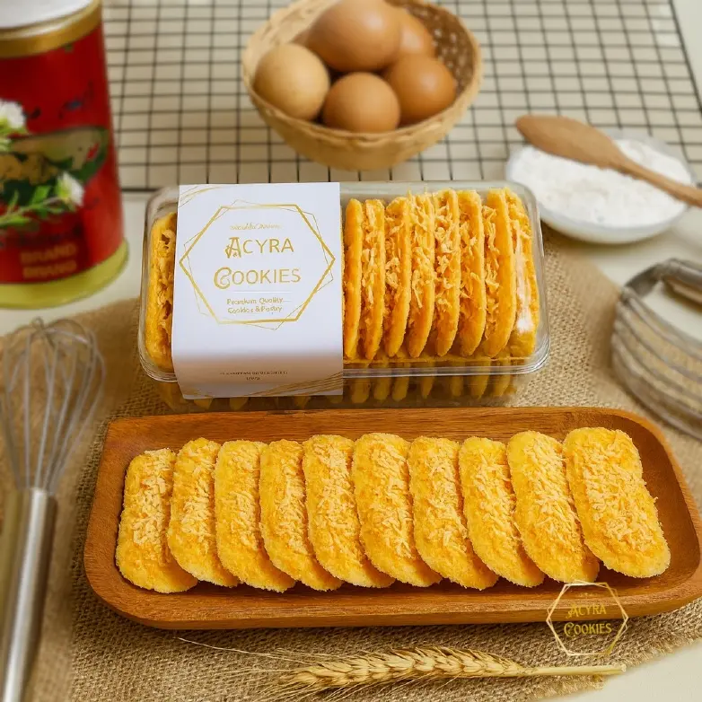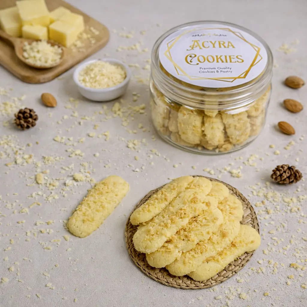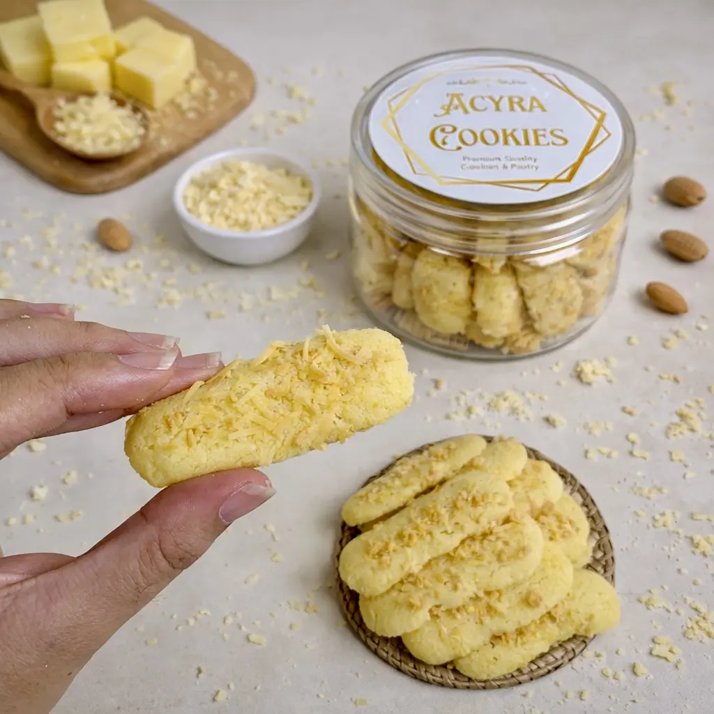 Lidah Kucing Keju Premium by Acyra Cookies adalah pilihan sempurna bagi Anda pecinta kue kering yang renyah, wangi, dan kaya rasa. Dibuat dari bahan-bahan berkualitas seperti butter pilihan, telur segar, tepung premium, dan taburan keju melimpah, menghasilkan lidah kucing dengan tekstur tipis crunchy dan aroma keju yang gurih menggoda.