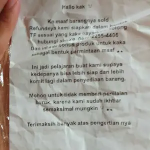 Saya kecewa sekali kk, lain kali kalau atok barang nya tidak ada ya jgan D kirim btalkn saja sungguh saya sangat kecewa D bayar perlu tp barang nggak sesuai😭😭😭mna baju D tunggu² kecewa