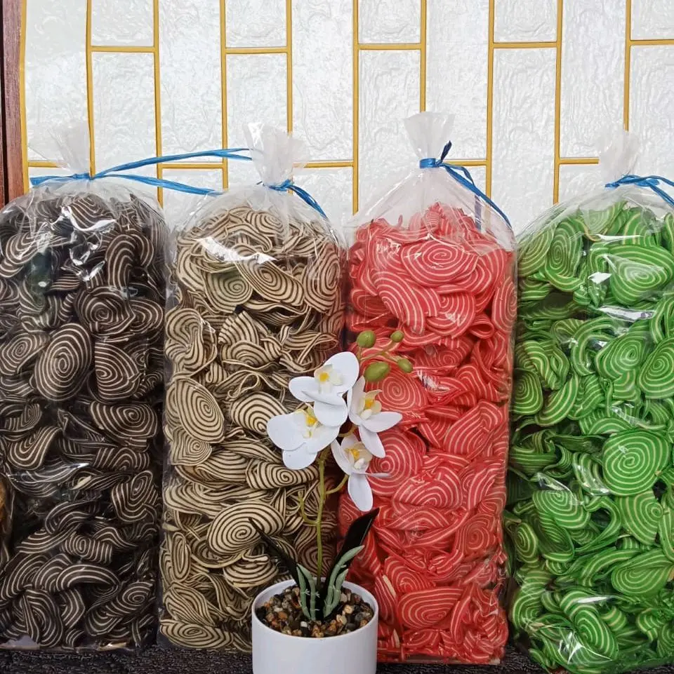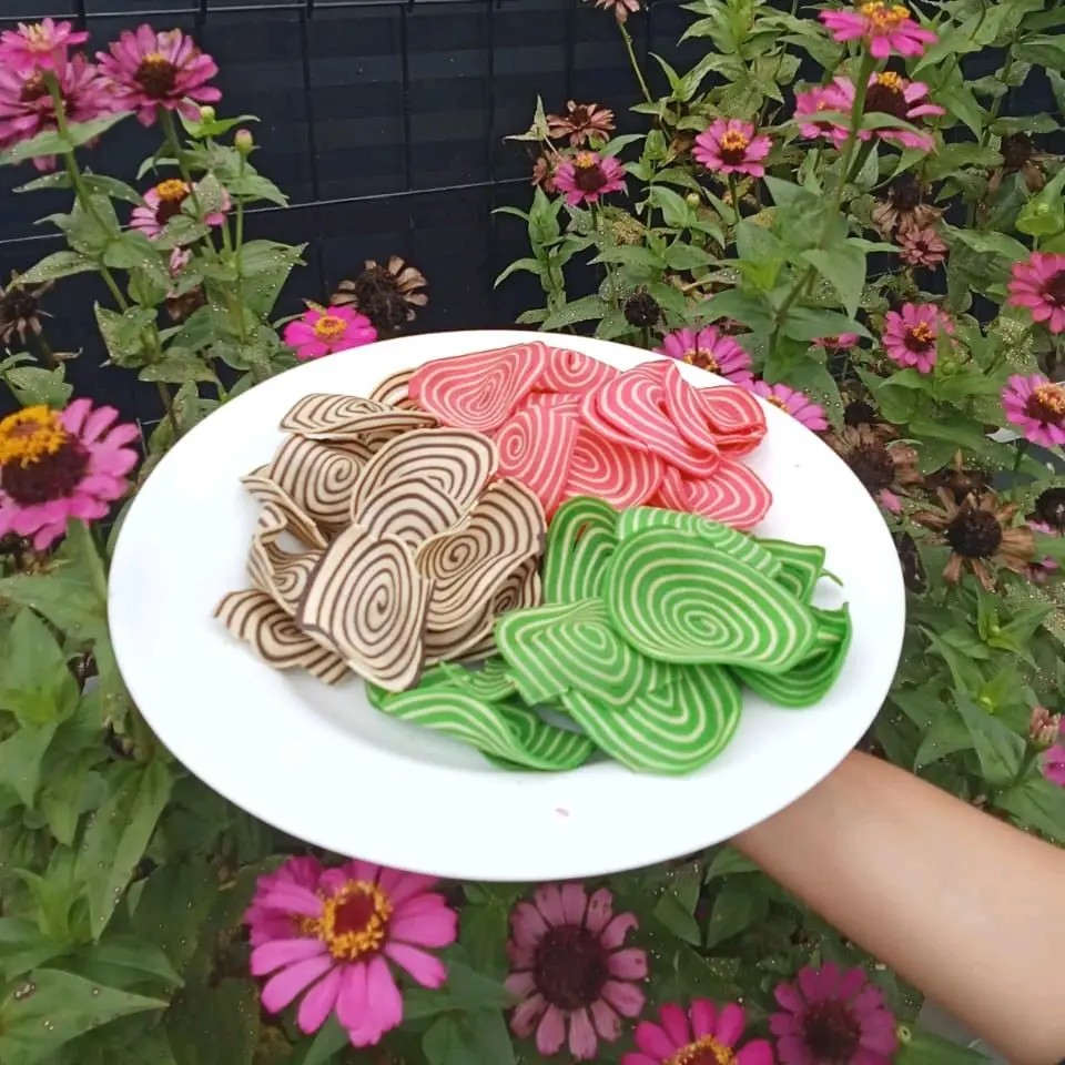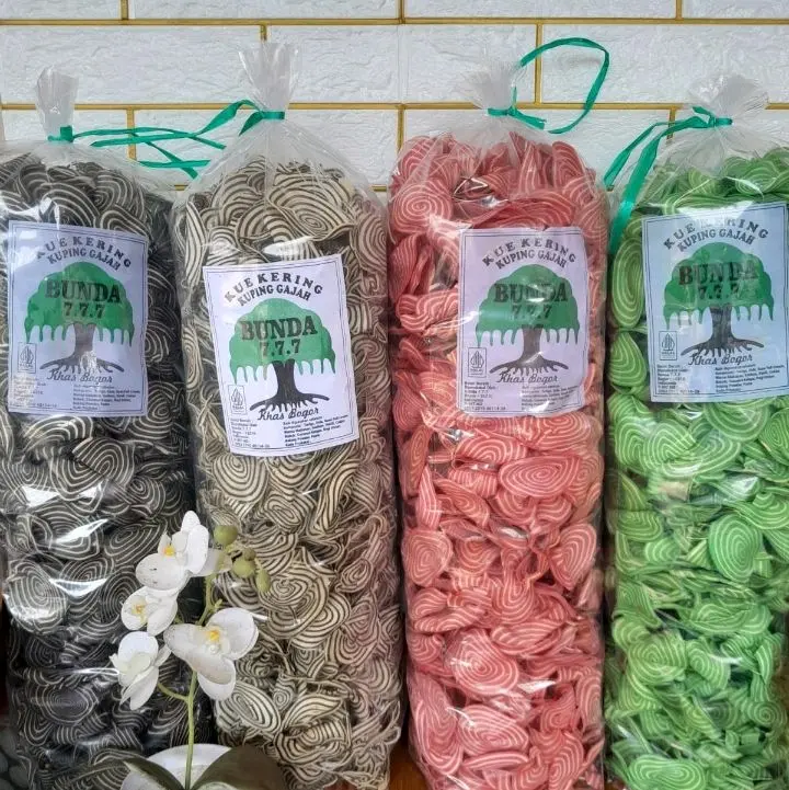 * Kuping gajah hadir dalam varian warna lengkap: coklat, putih, pink, dan hijau. Pilih warna yang Anda sukai untuk camilan renyah ini.