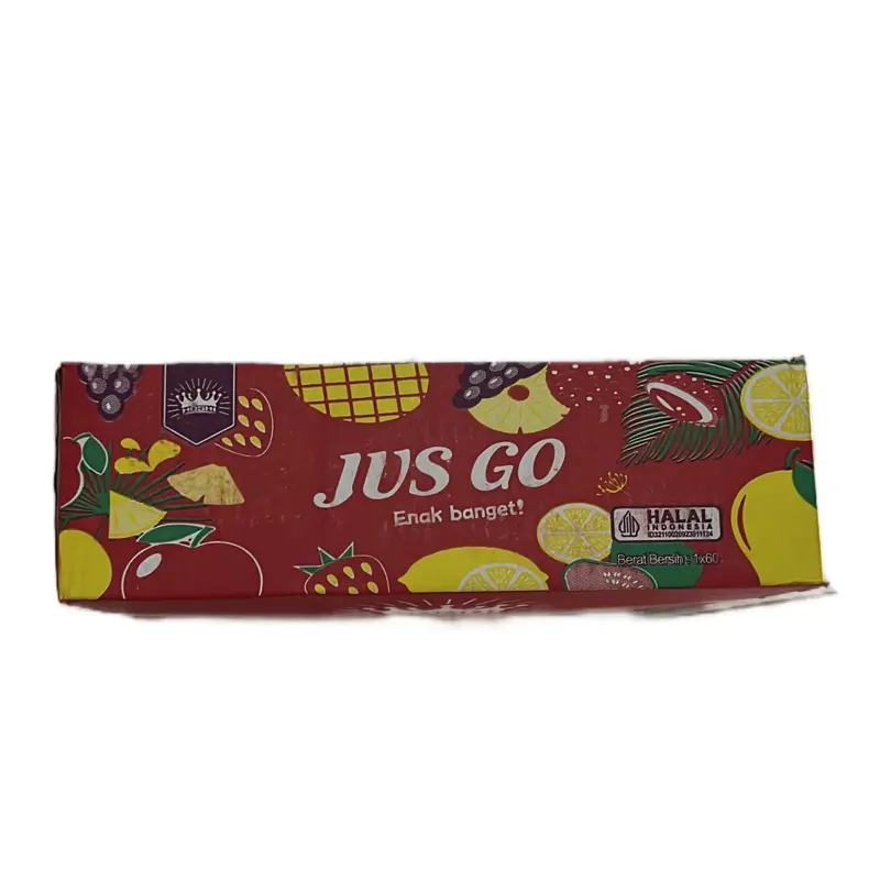 * Jus go adalah minuman yang tersedia dalam kardus. Setiap karton mengandung 60 pcs jus dengan rasa campur. Cocok untuk Anda yang mencari minuman Juice Gula.