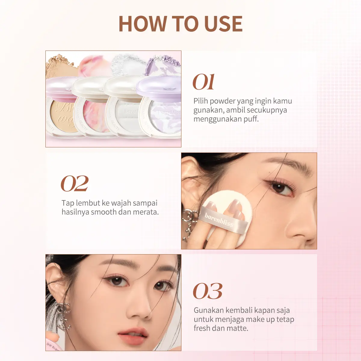Using the included puff or a powder brush, gently apply to the face as needed.