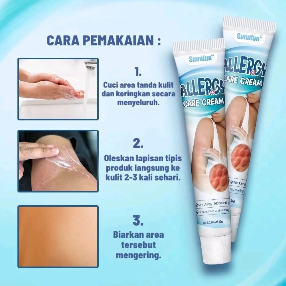 * Gunakan Sumifun Allergy Care Cream untuk meredakan kulit gatal dan alergi. Cocok untuk penggunaan sehari-hari untuk menjaga kesehatan kulit Anda.