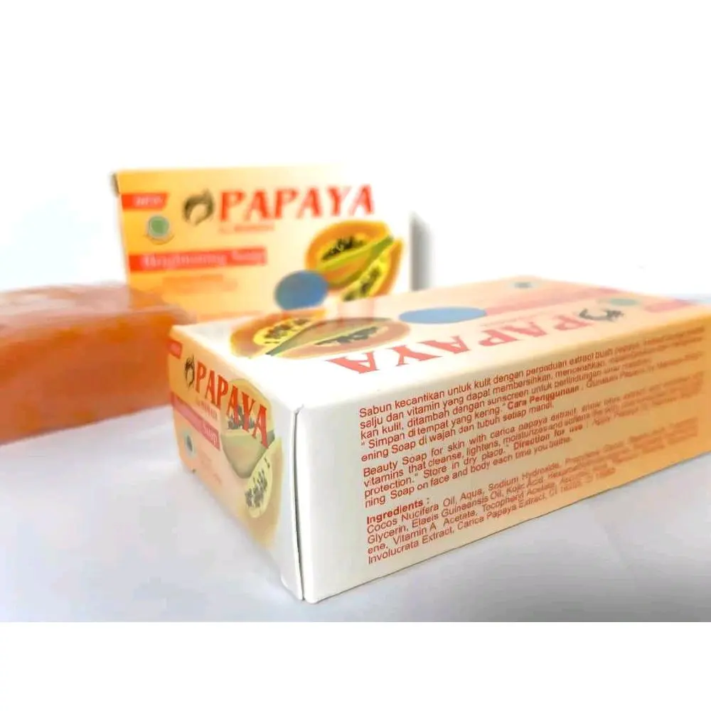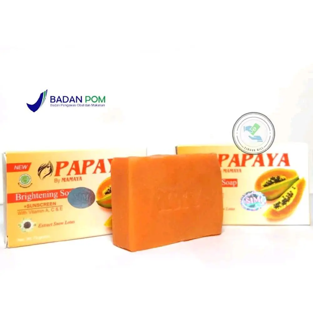 Sabun pemutih Papaya by mamaya yang berasal dari bahan dasar ramuan pepaya penuh ditambah vitamin agar kulit makin muda terlihat. Mengandung vitamin A, C, E + sunscreen & Extract Snow Lotus.